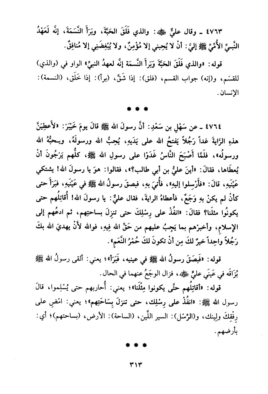 4764 - عن سَهْلِ بن سَعْدِ: أنَّ رسولَ الله - صلى الله عليه وسلم - قالَ يومَ خَيْبَرَ: "لأَعطِيَنَّ هذهِ الرَّايةَ غدًا رَجُلًا يَفتحُ الله على يَدَيهِ، يُحِبُّ الله ورسولَهُ، ويحبُّهُ الله ورسولُه"، فلَمَّا أَصْبَحَ النَّاسُ غَدَوْا على رسولِ الله - صلى الله عليه وسلم -، كلُّهم يَرْجُونَ أنْ يُعطَاها، فقالَ: "أينَ عليُّ بن أبي طالب؟ "، فقالوا: هوَ يا رسولَ الله! يشتكي عَيْنَيهِ، قالَ: "فاَرْسِلوا إليهِ"، فأُتيَ بهِ، فبصقَ رسولُ الله - صلى الله عليه وسلم - في عَيْنَيهِ، فبَرَأَ حتى كأنْ لم يكنْ بهِ وَجَعٌ، فأعطاهُ الرايةَ، فقال عليٌّ: يا رسولَ الله! أُقاتِلُهم حتى يكونُوا مثلَنا؟ فقالَ: "انفُذْ على رِسْلِكَ حتى تنزِلَ بساحتِهم، ثم ادعُهم إلى الإِسلامِ، وأخبرْهم بما يَجِبُ عليهم من حَقِّ الله فِيهِ، فوالله لأَنْ يهديَ الله بكَ رَجُلًا واحِدًا خيرٌ لكَ مِن أنْ تكونَ لكَ حُمْرُ النَّعَمِ".