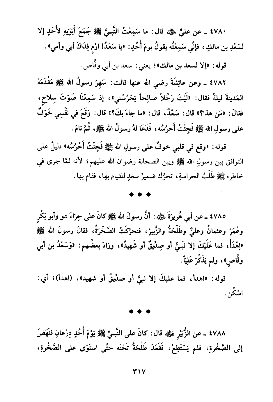 4782 - وعن عائِشَةَ رضي الله عنها قالت: سَهِرَ رسولُ الله - صلى الله عليه وسلم - مَقْدَمَهُ المَدينةَ ليلةً فقال: "لَيْتَ رَجُلًا صالِحًا يَحْرُسُني"، إذ سَمِعْنَا صوْتَ سِلاحٍ، فقالَ: "مَن هذا؟ " قال: سَعْدٌ، قال: "ما جاءَ بكَ؟ " قال: وَقَعَ في نَفْسِي خَوْفٌ على رسولِ الله - صلى الله عليه وسلم - فَجئْتُ أَحرُسُه، فَدَعَا لهُ رسولُ الله - صلى الله عليه وسلم -، ثُمَّ نامَ.