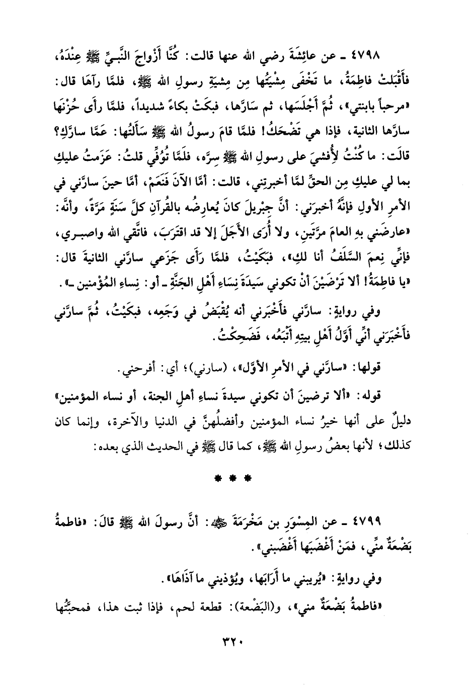 4798 - عن عائِشَةَ رضي الله عنها قالت: كُنَّا أَزْواجَ النَّبيِّ - صلى الله عليه وسلم - عِنْدَهُ، فأَقْبَلتْ فاطِمَةُ، ما تَخْفَى مِشْيَتُها مِن مِشيَةِ رسولِ الله - صلى الله عليه وسلم -، فلمَّا رآهَا قال: "مرحبًا بابنتي"، ثُمَّ أَجْلَسَها، ثم سَارَّها، فبكَتْ بكاءً شديدًا، فلمَّا رأَى حُزْنَها سارَّها الثانية، فإذا هي تَضْحَكُ! فلمَّا قامَ رسولُ الله - صلى الله عليه وسلم - سَأَلتُها: عَمَّا سارَّكِ؟ قالَت: ما كُنْتُ لأُفشيَ على رسولِ الله - صلى الله عليه وسلم - سِرَّه، فلَمَّا تُوُفِّي قلتُ: عَزَمتُ عليكِ بما لي عليكِ مِن الحقِّ لمَّا أخبرتِني، قالت: أمَّا الآنَ فَنَعَمْ، أمَّا حينَ سارَّني في الأمرِ الأولِ فإنَّهُ أخبرَني: أنَّ جِبْريلَ كانَ يُعارِضُه بالقُرآنِ كلَّ سَنَةٍ مَرَّةً، وأنَّه: "عارضَني بهِ العامَ مرَّتَينِ، ولا أُرَى الأَجَلَ إلا قد اقتَرَبَ، فاتَّقي الله واصبري، فإنِّي نِعمَ السَّلَفُ أنا لكِ"، فبَكَيْتُ، فلمَّا رَأَى جَزَعي سارَّني الثانيةَ قال: "يا فاطِمَةُ! ألا تَرْضَيْنَ أنْ تكوني سَيدَةَ نِسَاءِ أَهْلِ الجَنَّةِ - أو: نِساءِ المُؤْمنين -".