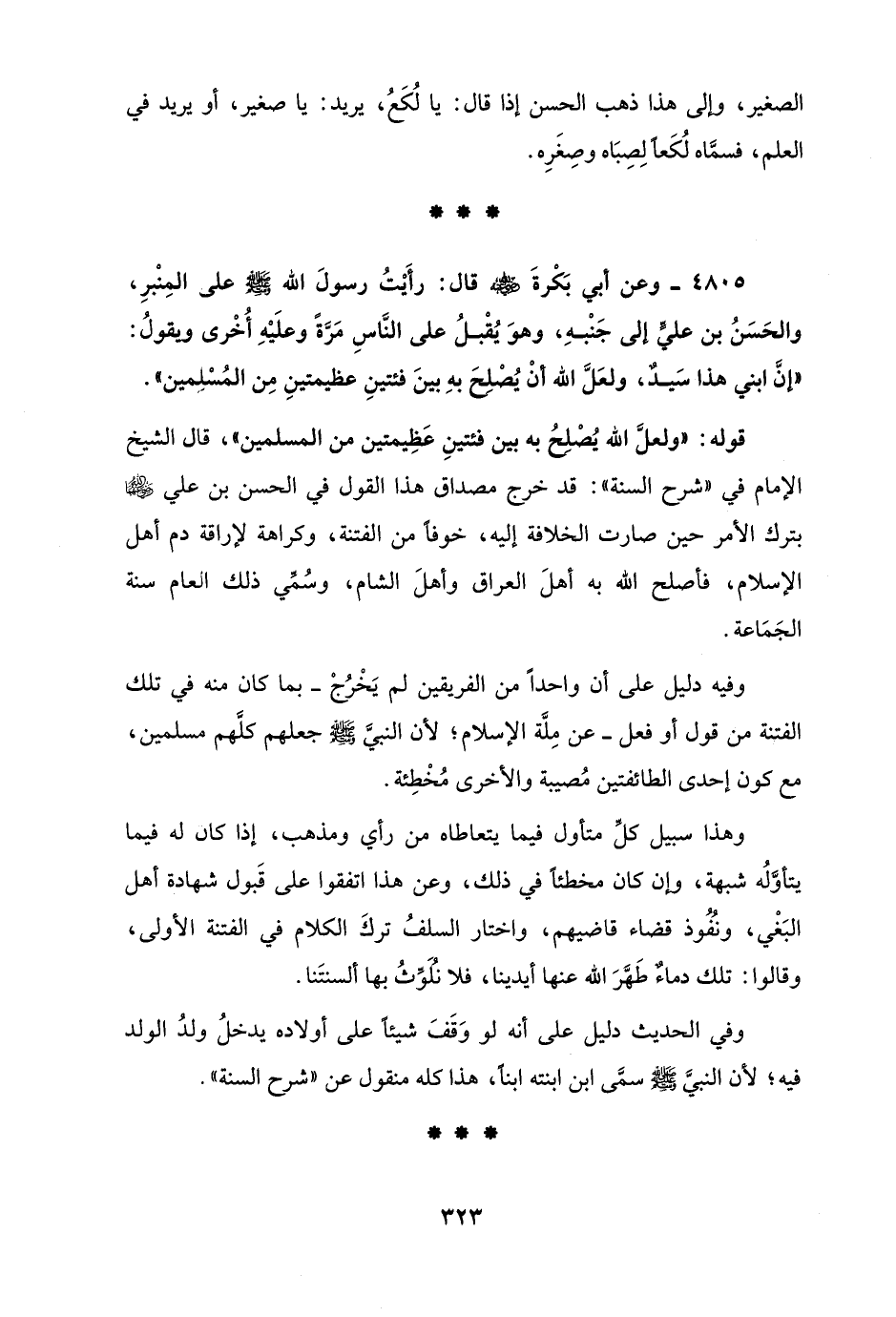 4805 - وعن أبي بَكْرةَ - رضي الله عنه - قال: رأَيتُ رسولَ الله - صلى الله عليه وسلم - على المِنْبرِ، والحَسَنُ بن عليٍّ إلى جَنْبهِ، وهوَ يُقْبلُ على النَّاسِ مَرَّةً وعلَيْهِ أُخْرى ويقولُ: "إنَّ ابني هذا سَيدٌ، ولعَلَّ الله أنْ يُصْلِحَ بهِ بينَ فئتينِ عظيمتينِ مِن المُسْلِمين".
