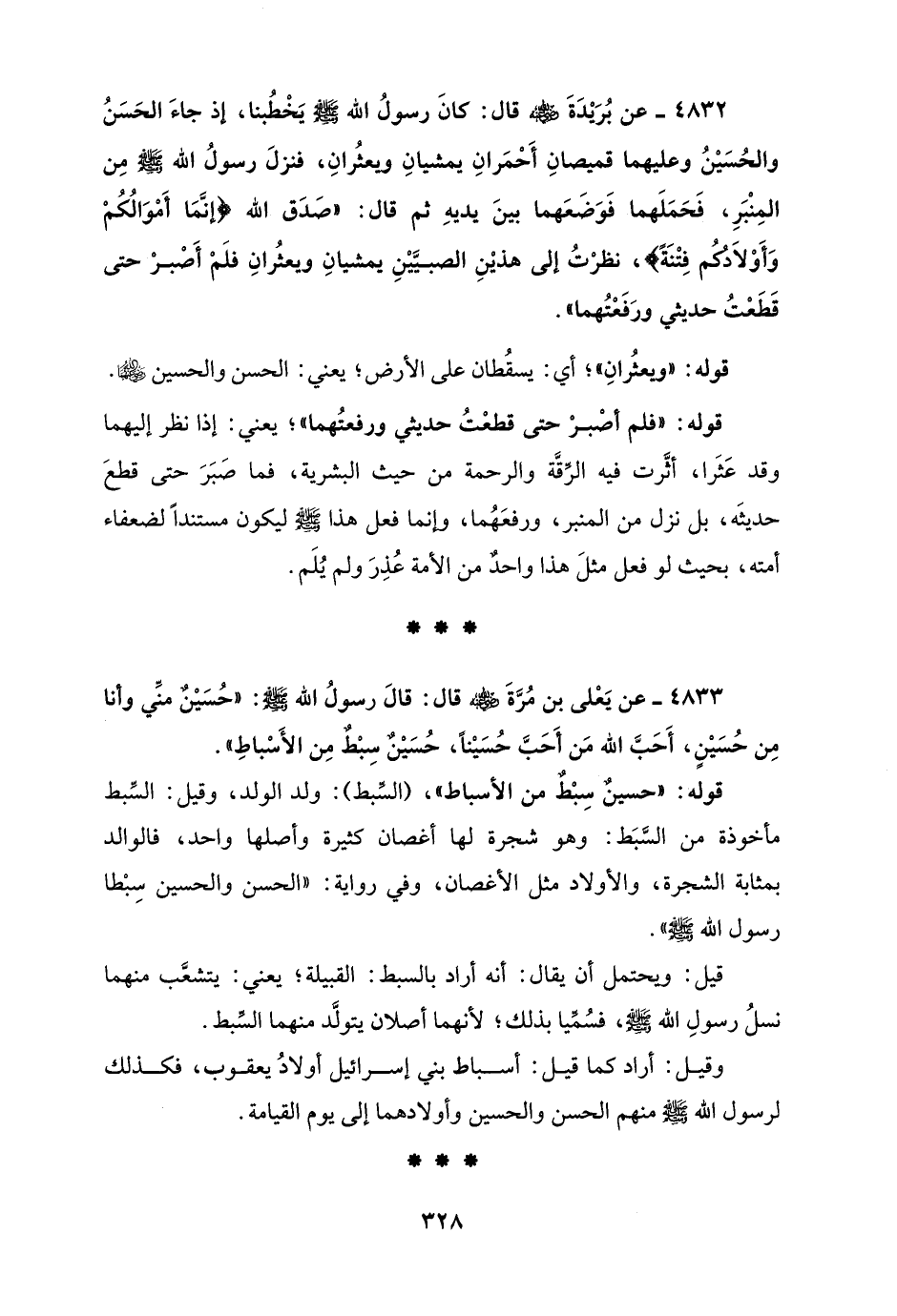 4833 - عن يَعْلى بن مُرَّةَ - رضي الله عنه - قال: قالَ رسولُ الله - صلى الله عليه وسلم -: "حُسَيْنٌ منِّي وأنا مِن حُسَيْنٍ، أَحَبَّ الله مَن أَحَبَّ حُسَيْنًا، حُسَيْنٌ سِبْطٌ مِن الأَسْباطِ".