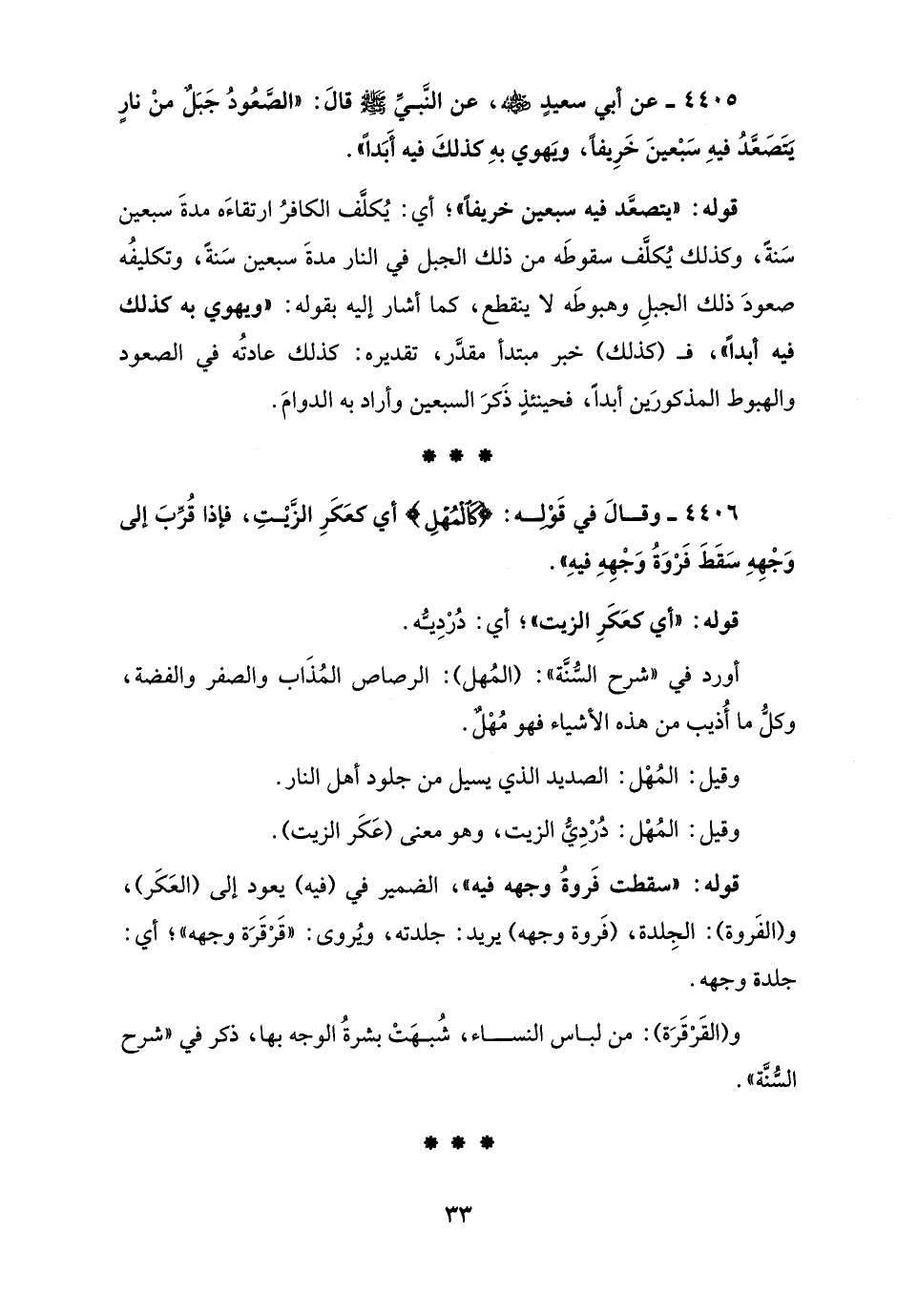 4406 - وقالَ في قَوْلِه: {كَالْمُهْلِ} أي كعَكَرِ الزَّيْتِ، فإذا قُرِّبَ إلى وَجْهِهِ سَقَطَ فَرْوَةُ وَجْهِهِ فيهِ".