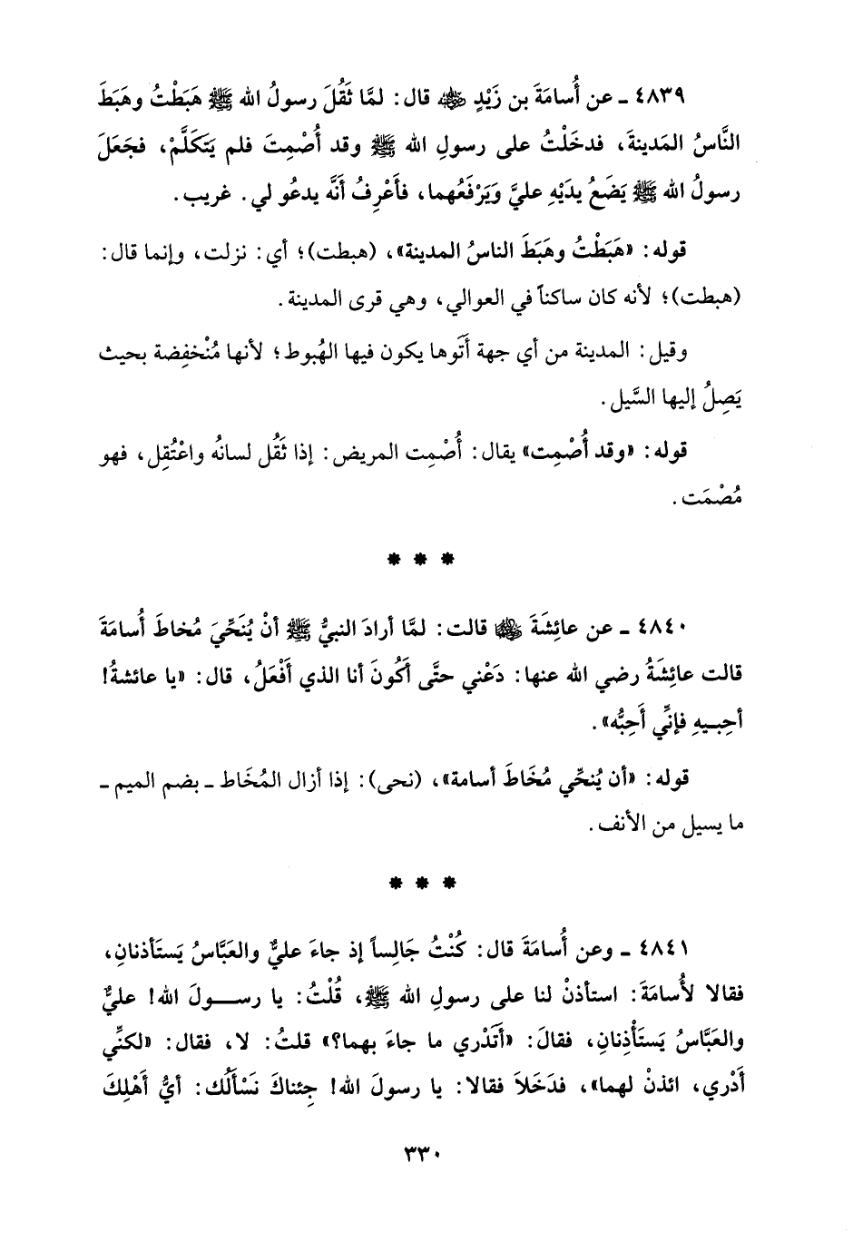 4839 - عن أُسامَةَ بن زيْدٍ - رضي الله عنه - قال: لمَّا ثَقُلَ رسولُ الله - صلى الله عليه وسلم - هَبَطْتُ وهَبَطَ النَّاسُ المَدينةَ، فدخَلْتُ على رسولِ الله - صلى الله عليه وسلم - وقد أُصْمِتَ فلم يَتَكَلَّمْ، فجَعَلَ رسولُ الله - صلى الله عليه وسلم - يَضَعُ يدَيْهِ عليَّ وَيَرْفَعُهما، فأَعْرِفُ أَنَّه يدعُو لي. غريب.