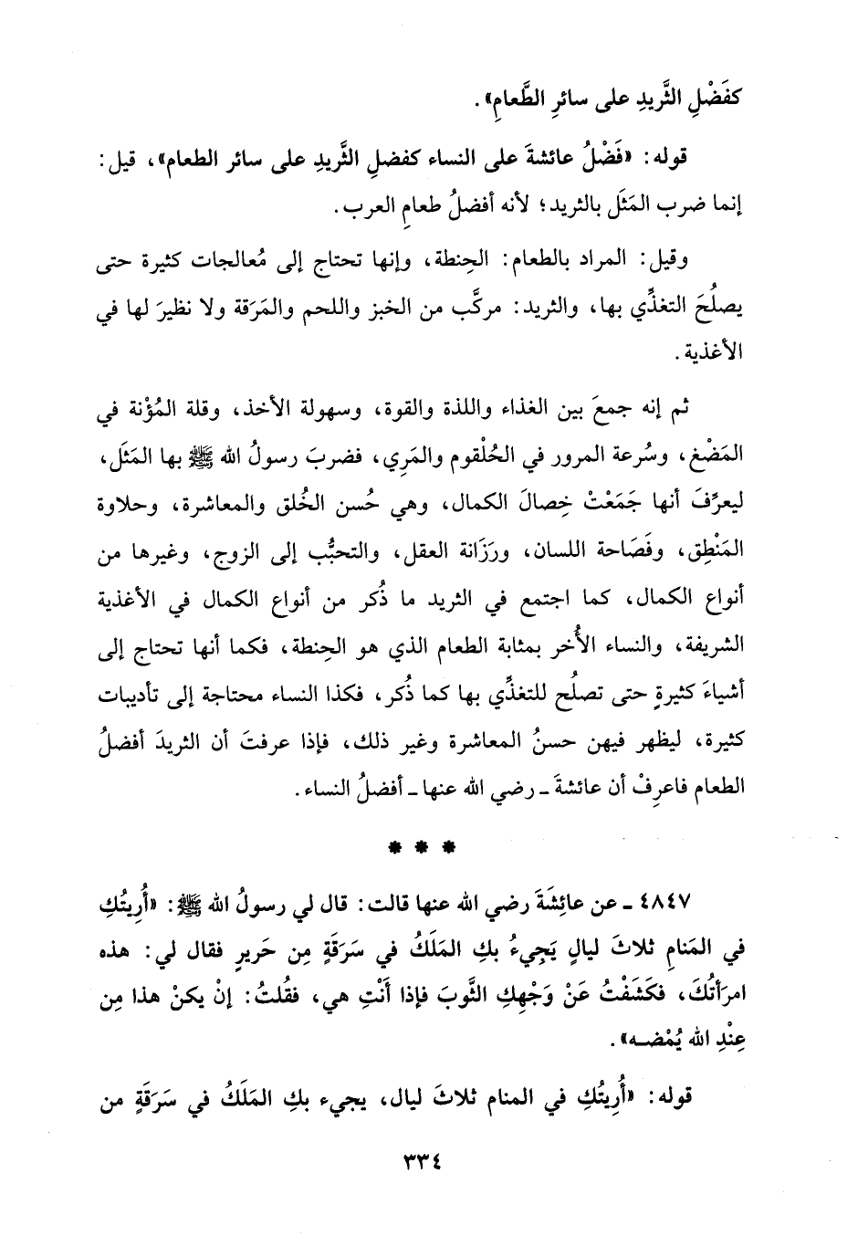 ثم إنه جمعَ بين الغذاء واللذة والقوة، وسهولة الأخذ، وقلة المُؤْنة في المَضْغ، وسُرعة المرور في الحُلْقوم والمَرِي، فضربَ رسولُ الله - صلى الله عليه وسلم - بها المَثَل، ليعرِّفَ أنها جَمَعْتْ خِصالَ الكمال، وهي حُسن الخُلق والمعاشرة، وحلاوة المَنْطِق، وفَصَاحة اللسان، ورَزَانة العقل، والتحبُّب إلى الزوج، وغيرها من أنواع الكمال، كما اجتمع في الثريد ما ذُكر من أنواع الكمال في الأغذية الشريفة، والنساء الأُخر بمثابة الطعام الذي هو الحِنطة، فكما أنها تحتاج إلى أشياءَ كثيرةٍ حتى تصلُح للتغذِّي بها كما ذُكر، فكذا النساء محتاجة إلى تأديبات كثيرة، ليظهر فيهن حسنُ المعاشرة وغير ذلك، فإذا عرفتَ أن الثريدَ أفضلُ الطعام فاعرِفْ أن عائشةَ - رضي الله عنها - أفضلُ النساء.