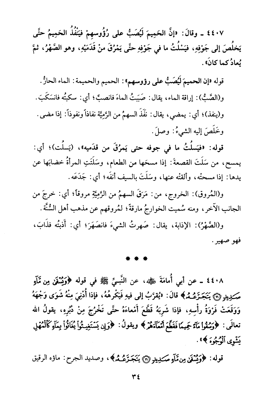 4408 - عن أبي أُمامَةَ - رضي الله عنه -، عن النَّبيِّ - صلى الله عليه وسلم - في قوله {وَيُسْقَى مِنْ مَاءٍ صَدِيدٍ (16) يَتَجَرَّعُهُ} قالَ: "يُقرَّبُ إلى فيهِ فَيَكْرهُهُ، فإذا أُدْنِيَ مِنْهُ شَوَى وَجْهَهُ وَوَقَعَتْ فَرْوَةُ رأْسِهِ، فإذا شَرِبَهُ قَطَّعَ أَمْعاءَهُ حتَّى تَخْرُجَ مِنْ دُبُرِهِ، يقولُ الله تعالَى: {وَسُقُوا مَاءً حَمِيمًا فَقَطَّعَ أَمْعَاءَهُمْ} ويقولُ: {وَإِنْ يَسْتَغِيثُوا يُغَاثُوا بِمَاءٍ كَالْمُهْلِ يَشْوِي الْوُجُوهَ} ".