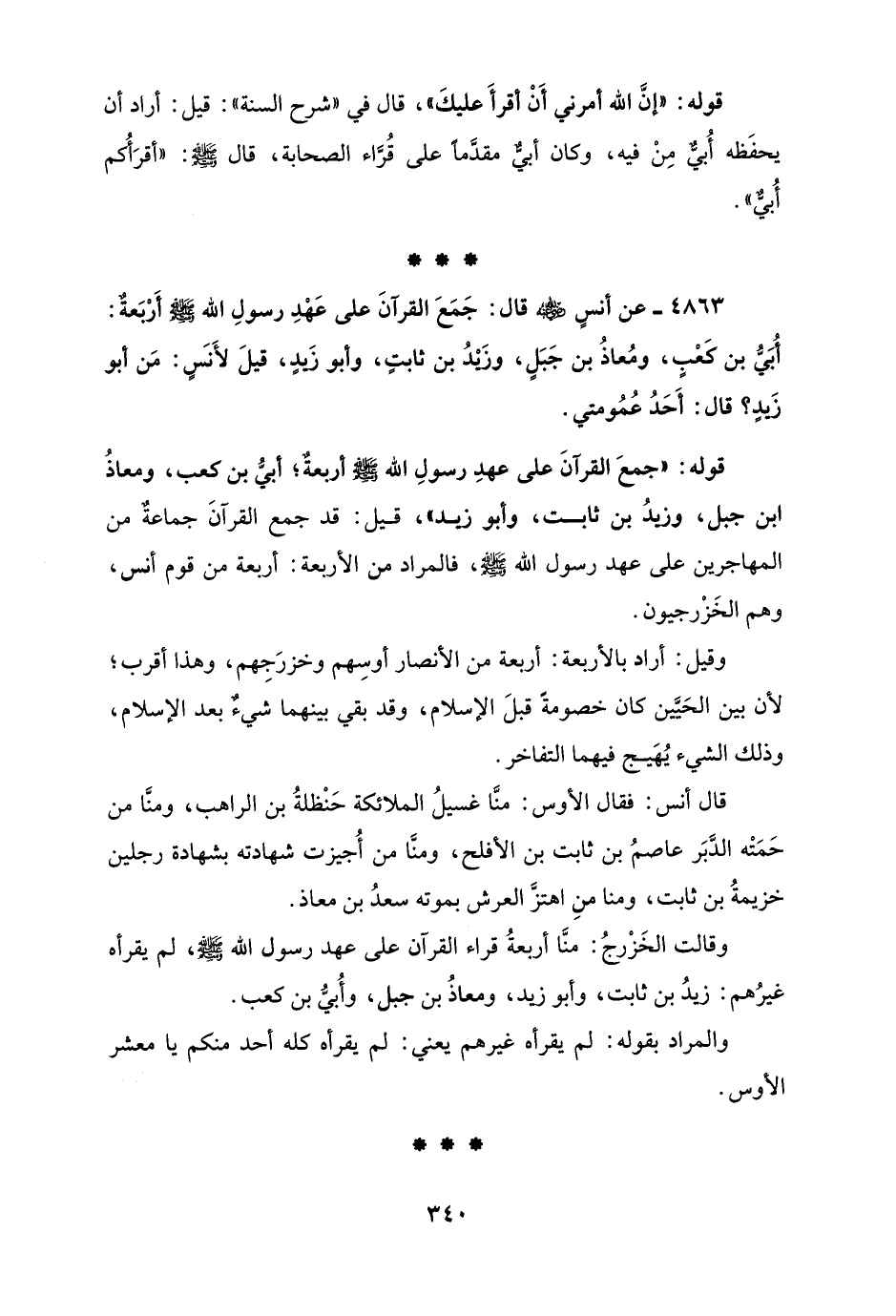 4863 - عن أنسٍ - رضي الله عنه - قال: جَمَعَ القرآنَ على عَهْدِ رسولِ الله - صلى الله عليه وسلم - أَرْبَعةٌ: أُبَيُّ بن كَعْبٍ، ومُعاذُ بن جَبَلٍ، وزيدُ بن ثابتٍ، وأبو زَيدٍ، قيلَ لأَنَسٍ: مَن أبو زَيدٍ؟ قال: أَحَدُ عُمُومتي.