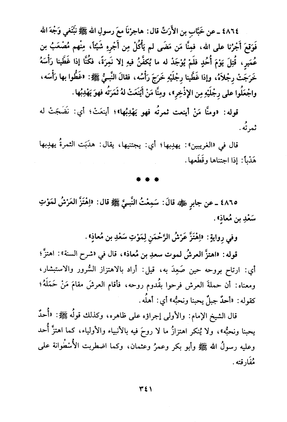 4865 - عن جابرٍ - رضي الله عنه - قالَ: سَمِعْتُ النَّبيَّ - صلى الله عليه وسلم - قال: "اِهْتَزَّ العَرْشُ لمَوْتِ سَعْدِ بن مُعاذٍ".