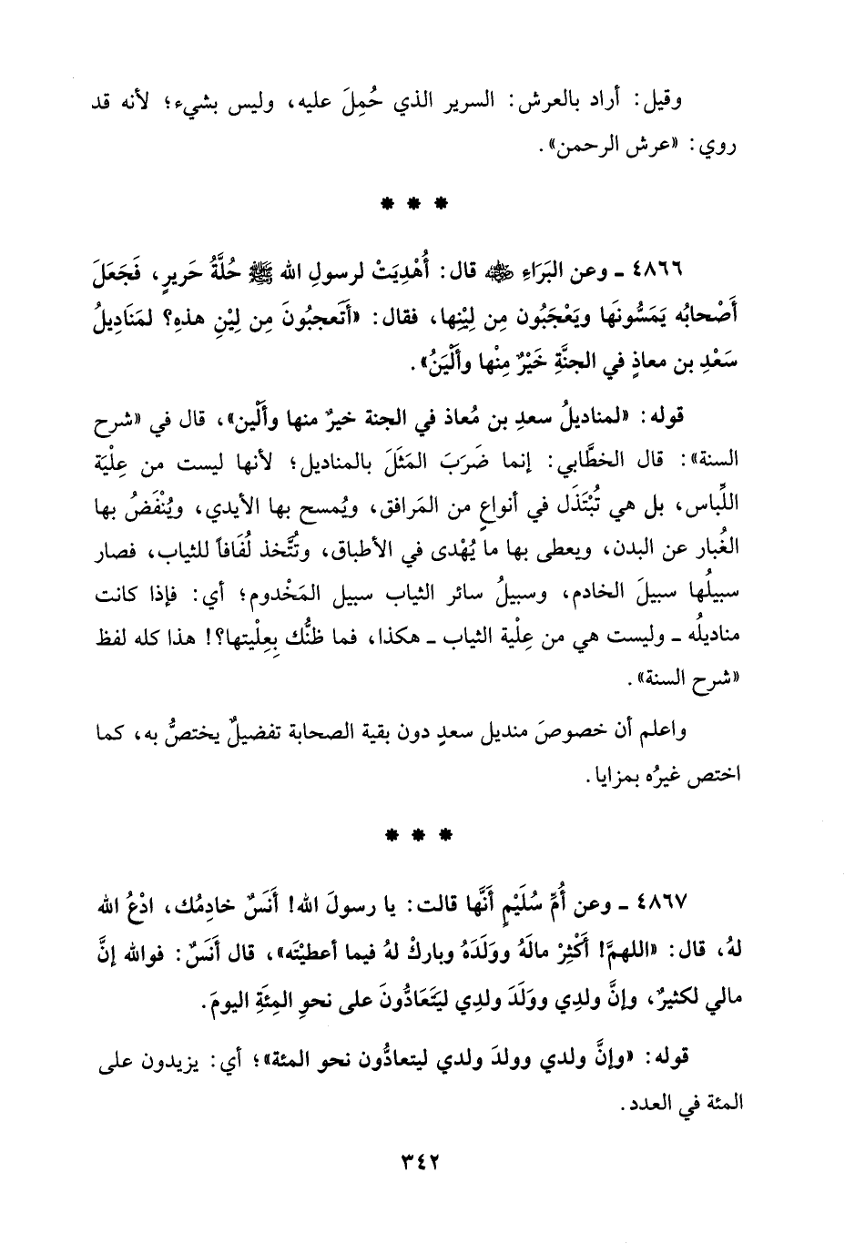 4866 - وعن البَرَاءِ - رضي الله عنه - قال: أُهْدِيَتْ لرسولِ الله - صلى الله عليه وسلم - حُلَّةُ حَريرٍ، فَجَعَلَ أَصْحابُه يَمَسُّونَها ويَعْجَبُون مِن لِيْنِها، فقال: "أَتَعجبُونَ مِن لِيْنِ هذهِ؟ لمَنَادِيلُ سَعْدِ بن معاذٍ في الجنَّةِ خَيْرٌ مِنْها وأَلْيَنُ".