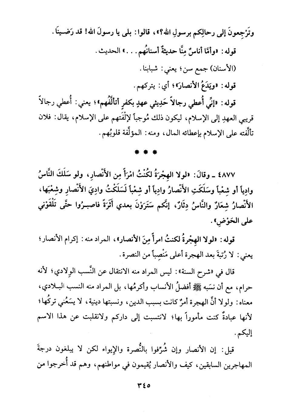 4877 - وقالَ: "لولا الهِجْرَةُ لكُنْتُ امْرَأً مِن الأَنْصارِ، ولو سَلَكَ النَّاسُ وادِيًا أو شِعْبًا وسَلَكَتِ الأَنْصارُ وادِيًا أو شِعْبًا لَسَلَكْتُ وادِيَ الأَنْصارِ وشِعْبَها، الأَنْصارُ شِعَارٌ والنَّاسُ دِثَارٌ، إنَّكم سَتَرَوْنَ بعدي أَثَرَةً فاصبرُوا حتَّى تَلْقَوْني على الحَوْضِ".