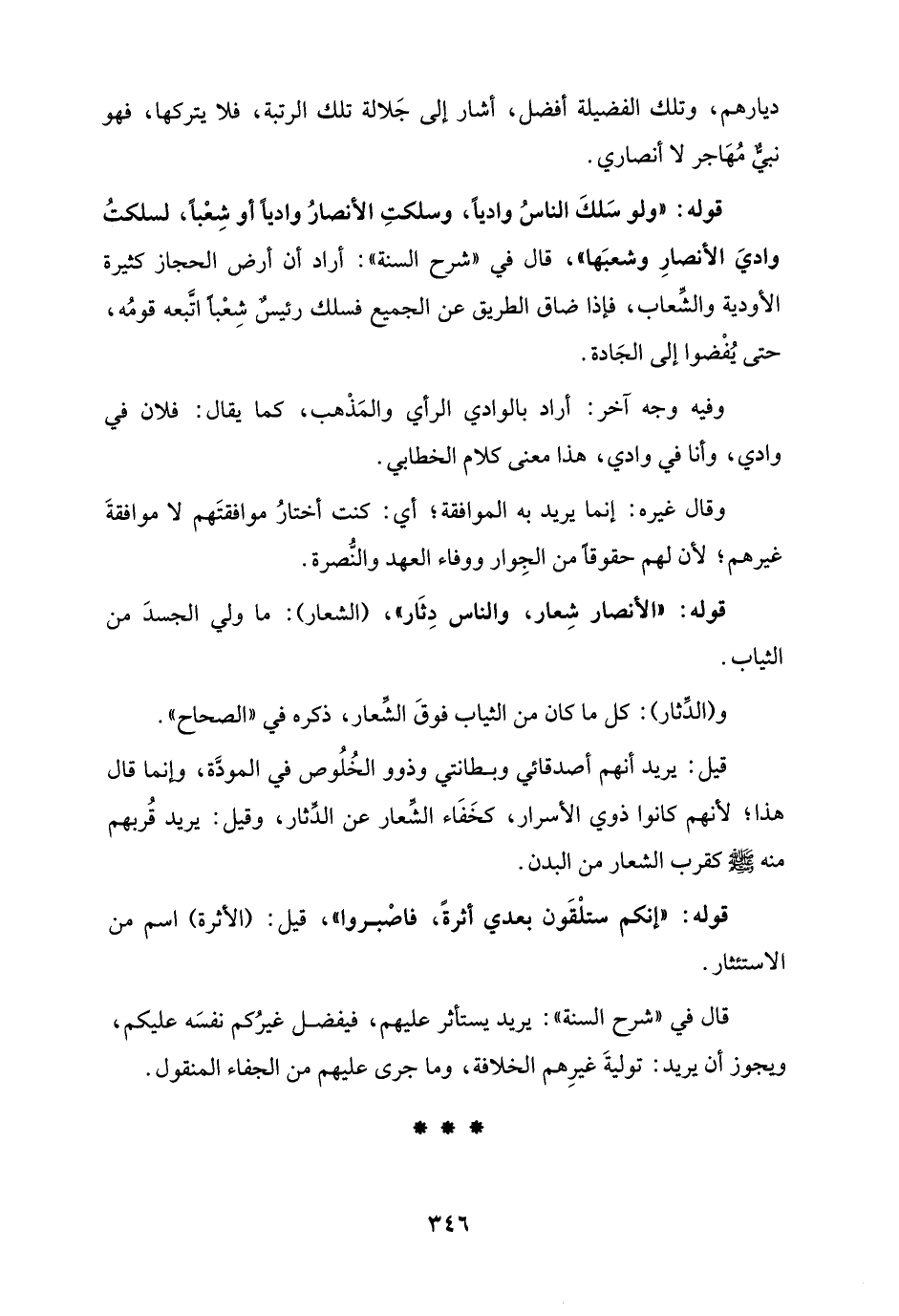 قوله: "ولو سَلكَ الناسُ واديًا، وسلكتِ الأنصارُ واديًا أو شِعْبًا، لسلكتُ واديَ الأنصارِ وشعبَها"، قال في "شرح السنة": أراد أن أرض الحجاز كثيرة الأودية والشِّعاب، فإذا ضاق الطريق عن الجميع فسلك رئيسٌ شِعْبًا اتَّبعه قومُه، حتى يُفْضوا إلى الجَادة.