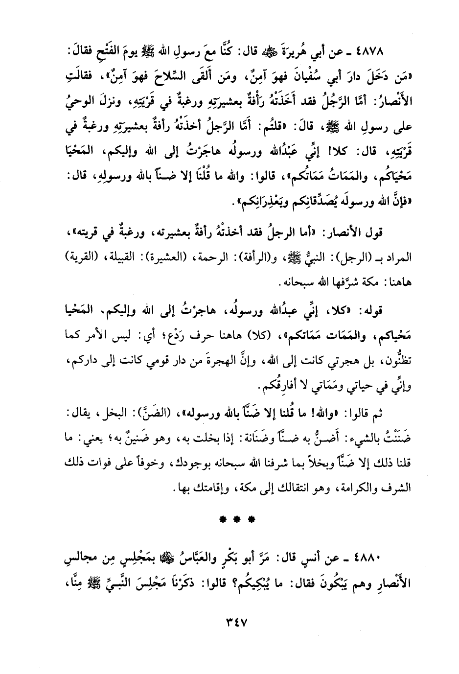 4880 - عن أنسٍ قال: مَرَّ أبو بَكْرٍ والعَبَّاسُ - رضي الله عنهما - بمَجْلِسٍ مِن مجالسِ الأَنْصارِ وهم يَبْكُونَ فقال: ما يُبْكِيكُم؟ قالوا: ذكَرْنَا مَجْلِسَ النَّبيِّ - صلى الله عليه وسلم - مِنَّا،