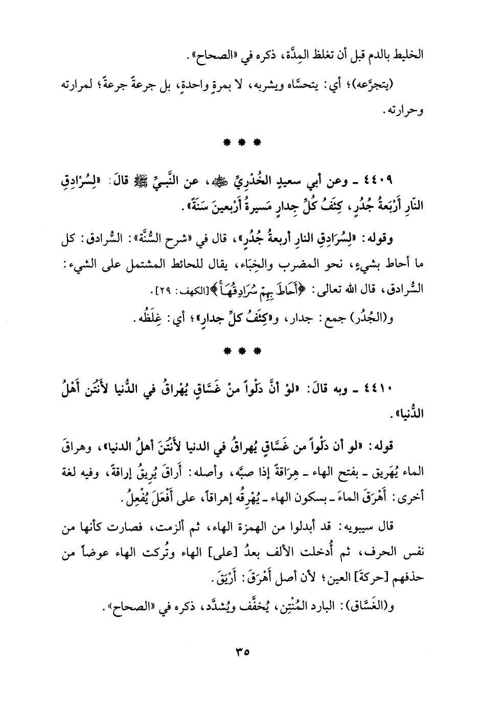 4409 - وعن أبي سعيدٍ الخُدْرِيِّ - رضي الله عنه -، عن النَّبيِّ - صلى الله عليه وسلم - قالَ: "لِسُرْادِقِ النّارِ أَرْبَعةُ جُدُرٍ، كِثَفُ كُلِّ جِدارٍ مَسيرةُ أَرْبعينَ سَنَةً".