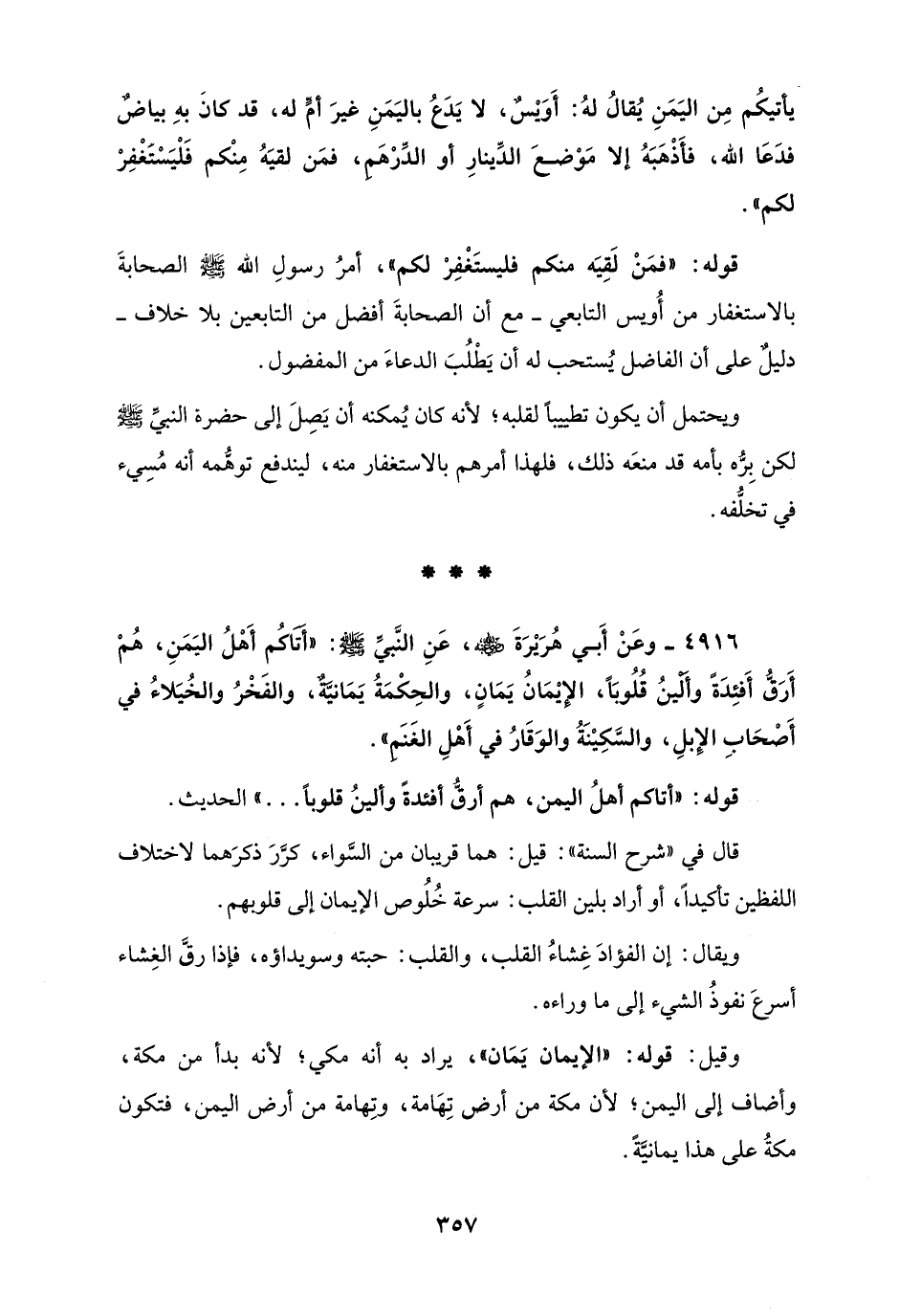 4916 - وعَنْ أَبي هُرَيْرَةَ - رضي الله عنه -، عَنِ النَّبيِّ - صلى الله عليه وسلم -: "أَتَاكُم أَهْلُ اليَمَنِ، هُمْ أَرَقُّ أَفئِدَةً وأَلْينُ قُلُوبًا، الإِيْمَانُ يَمَانٍ، والحِكْمَةُ يَمَانيَّةٌ، والفَخْرُ والخُيَلاءُ في أَصْحَابِ الإِبلِ، والسَّكِيْنَةُ والوَقَارُ في أَهْلِ الغَنَم".
