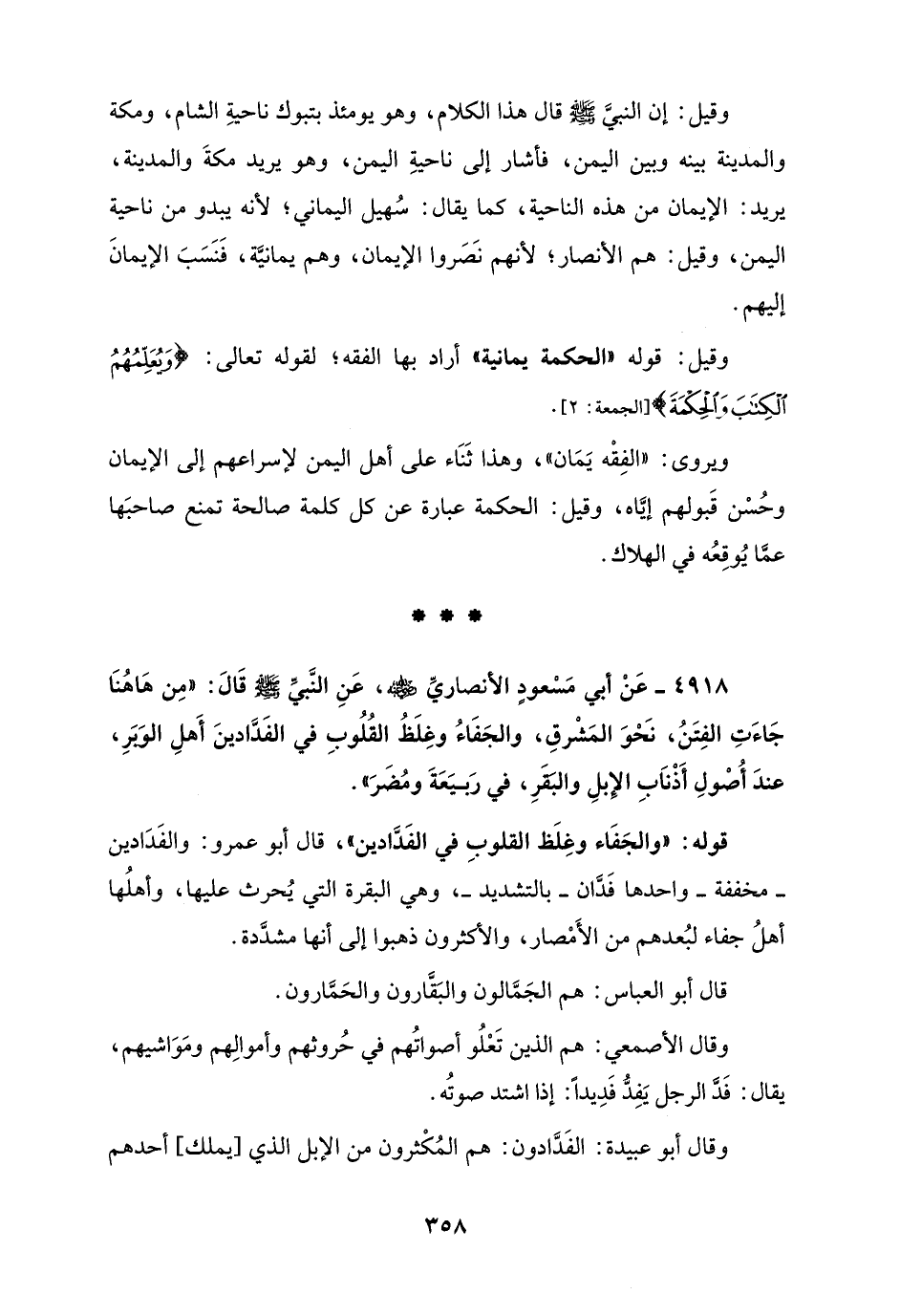 قوله: "والجَفَاء وغِلَظ القلوبِ في الفَدَّادين"، قال أبو عمرو: والفَدَادين - مخففة - واحدها فَدَّان - بالتشديد -، وهي البقرة التي يُحرث عليها، وأهلُها أهلُ جفاء لبُعدهم من الأَمْصار، والأكثرون ذهبوا إلى أنها مشدَّدة.