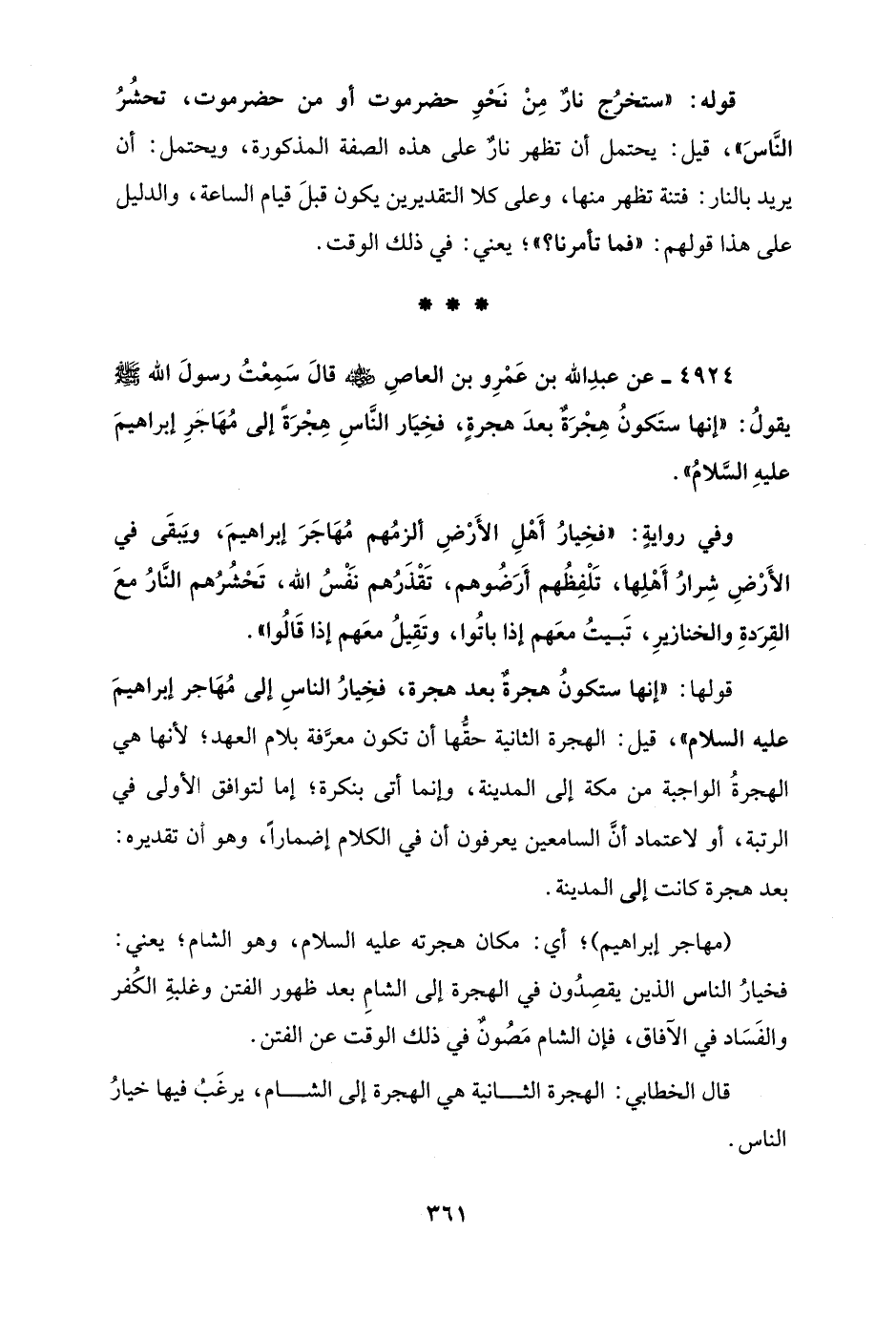 4924 - عن عبدِ الله بن عَمْرِو بن العاصِ - رضي الله عنه - قالَ سَمِعْتُ رسولَ الله - صلى الله عليه وسلم - يقولُ: "إنها ستَكونُ هِجْرَةٌ بعدَ هجرةٍ، فخِيَار النَّاسِ هِجْرَةً إلى مُهَاجَرِ إبراهيمَ عليهِ السَّلامُ".