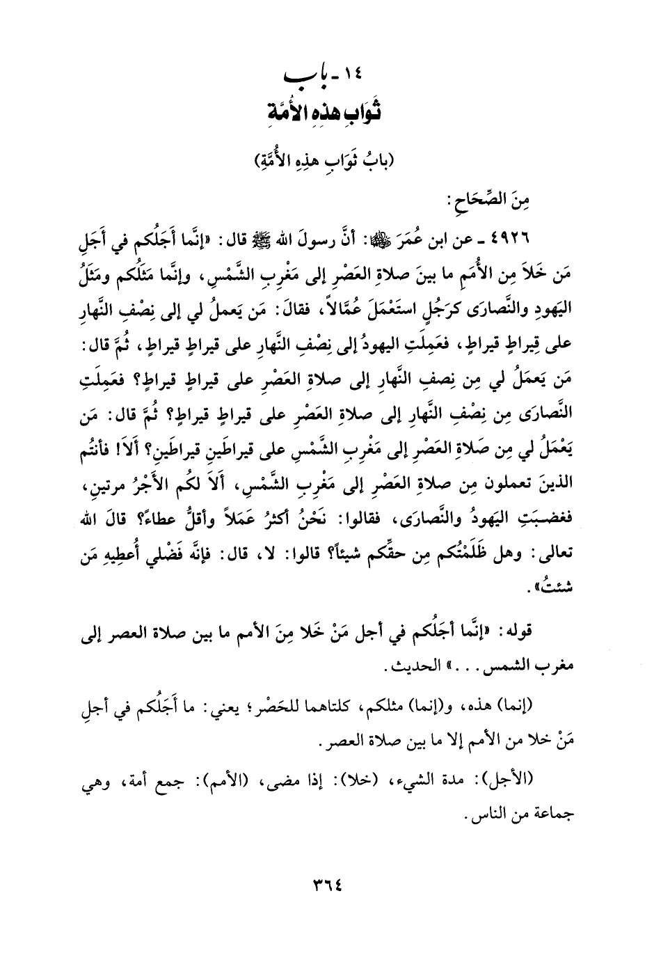 قوله: "إنَّما أجَلُكم في أجل مَنْ خَلا مِنَ الأمم ما بين صلاة العصر إلى مغرب الشمس ... " الحديث.