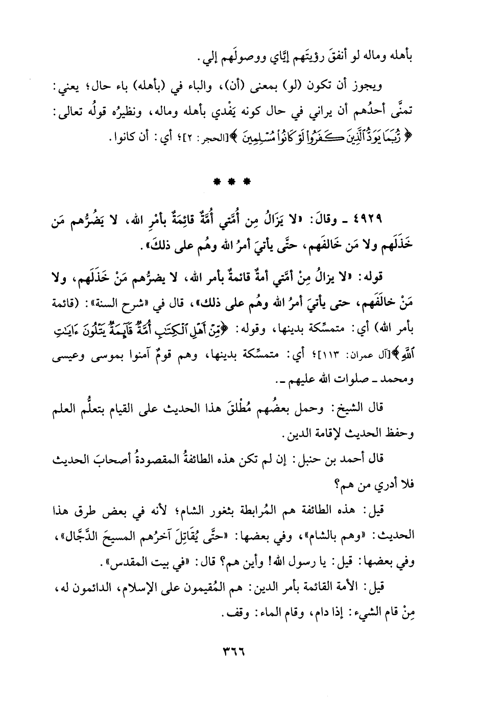 قوله: "لا يزالُ مِنْ أمَّتي أمةٌ قائمةٌ بأمر الله، لا يضرُّهم مَنْ خَذَلَهم، ولا مَنْ خالَفَهم، حتى يأتيَ أمرُ الله وهُم على ذلك"، قال في "شرح السنة": (قائمة بأمر الله) أي: متمسِّكة بدينها، وقوله: {مِنْ أَهْلِ الْكِتَابِ أُمَّةٌ قَائِمَةٌ يَتْلُونَ آيَاتِ اللَّهِ} [آل عمران: 113]؛ أي: متمسِّكة بدينها، وهم قومٌ آمنوا بموسى وعيسى ومحمد - صلوات الله عليهم -.