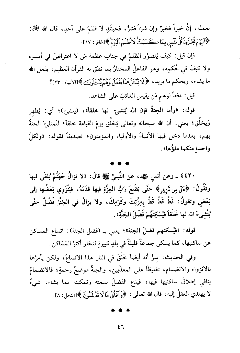 4420 - وعن أنسٍ - رضي الله عنه -، عن النَّبيِّ - صلى الله عليه وسلم - قالَ: "لا تزالُ جَهَنَّمُ يُلقَى فيها وتَقُولُ: {هَلْ مِنْ مَزِيدٍ} حتَّى يَضَعَ رَبُّ العِزَّةِ فيها قدَمَهُ، فيَنْزَوِي بَعْضُها إلى بَعْضٍ وتقولُ: قَطْ قَطْ قَطْ بِعِزَّتِكَ وكَرَمِكَ، ولا يزالُ في الجَنَّةِ فَضْلٌ حتَّى يُنْشِئَ الله لها خَلْقًا فيُسْكِنَهُمْ فَضْلَ الجَنَّةِ".
