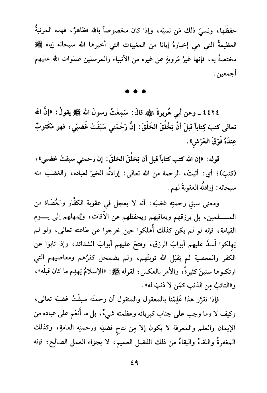 ومعنى سبقِ رحمتِه غضبَه: أنه لا يعجل في عقوبة الكفَّار والعُصَاة من المسلمين، بل يرزقهم ويعافيهم ويحفظهم عن الآفات، ويُمهلهم إلى يوم القيامة، فإنه لو لم يكن كذلك أُهلكوا حين خرجوا عن طاعته تعالى، ولو لم يَهِلكوا لَسدَّ عليهم أبوابَ الرزق، وفتحَ عليهم أبوابَ الشدائد، وإذ تابوا عن الكفر والمعصية لم يَقبَل الله توبتَهم، ولم يضمحل كفرُهم ومعاصيهم التي ارتكبوها سنينَ كثيرةً، والأمر بالعكس؛ لقوله - صلى الله عليه وسلم -: "الإسلامُ يَهدِم ما كان قبلَه"، و"التائبُ مِن الذنب كمَن لا ذنبَ له".