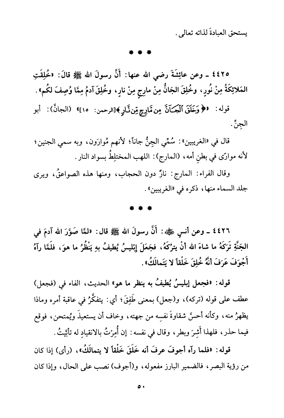 4425 - وعن عائِشَةَ رضي الله عنها: أَنَّ رسولَ الله - صلى الله عليه وسلم - قالَ: "خُلِقَتِ المَلائِكَةُ مِنْ نُورٍ، وخُلِقَ الجَانُّ مِنْ مارِجٍ مِنْ نارٍ، وخُلِقَ آدمُ مِمَّا وُصِفَ لكُم".
