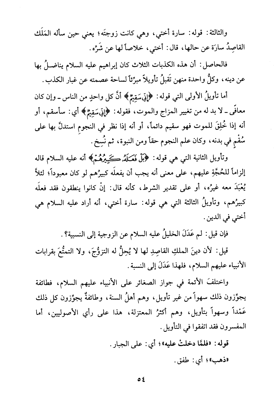 وتأويل الثانية التي هي قوله: {بَلْ فَعَلَهُ كَبِيرُهُمْ} أنه عليه السلام قاله إلزامًا للحُجَّةِ عليهم، على معنى أنه يجب أن يفعلَه كبيرُهم لو كان معبودًا؛ لئلَّا يُعْبَدَ معه غيرُه، أو على تقدير الشرط، كأنه قال: إنْ كانوا ينطقون فقد فعلَه كبيرُهم، وتأويلُ الثالثة التي هي قوله: سارة أختي، أنه أراد عليه السلام هي أختي في الدين.
