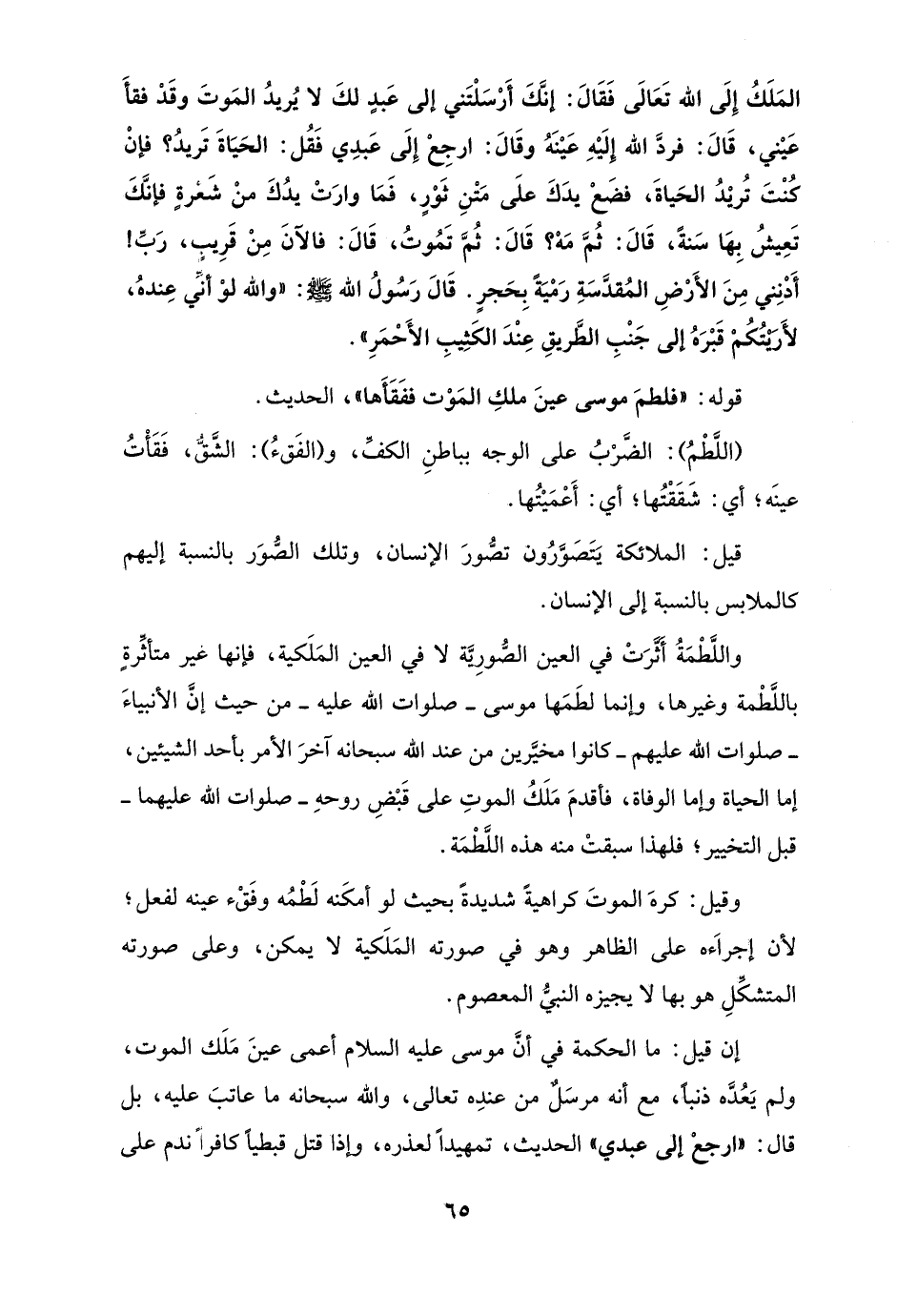 وقيل: كرهَ الموتَ كراهيةً شديدةً بحيث لو أمكَنه لَطْمُه وفَقْء عينه لفعل؛ لأن إجراءَه على الظاهر وهو في صورته المَلَكية لا يمكن، وعلى صورته المتشكِّلِ هو بها لا يجيزه النبيُّ المعصوم.