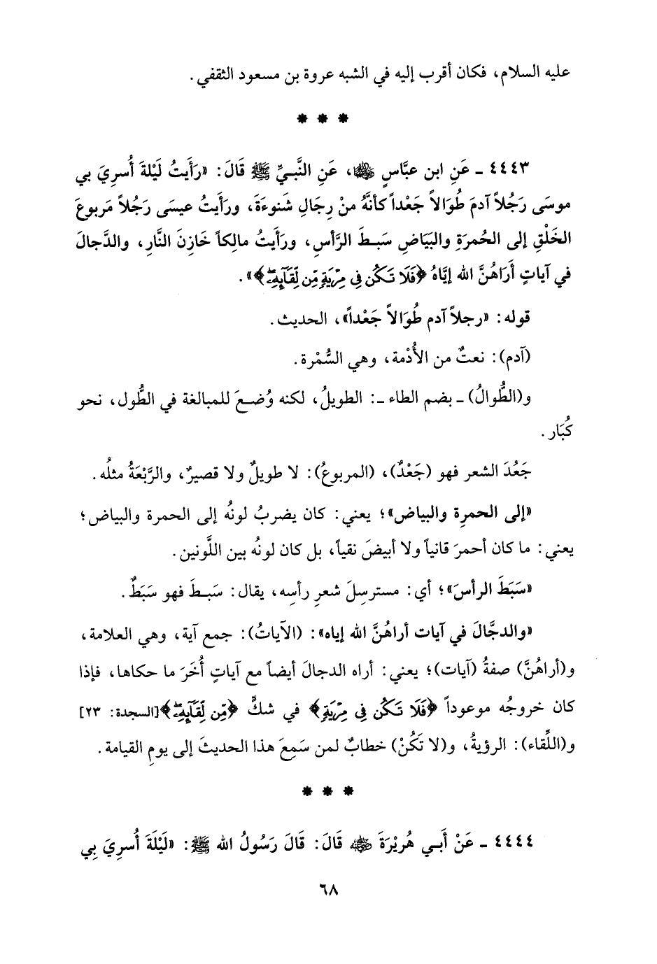 4443 - عَنِ ابن عبَّاسٍ - رضي الله عنهما -، عَنِ النَّبيِّ - صلى الله عليه وسلم - قَالَ: "رَأَيتُ لَيْلةَ أُسرِيَ بي موسَى رَجُلًا آدمَ طُوَالًا جَعْدًا كأنَّهُ منْ رِجَالِ شَنوءَةَ، ورَأَيتُ عيسَى رَجُلًا مَربوعَ الخَلْقِ إلى الحُمرَةِ والبَيَاضِ سَبطَ الرَّأسِ، ورَأَيتُ مالِكًا خَازِنَ النَّارِ، والدَّجالَ في آياتٍ أَرَاهُنَّ الله إيَّاهُ {فَلَا تَكُنْ فِي مِرْيَةٍ مِنْ لِقَائِهِ} ".