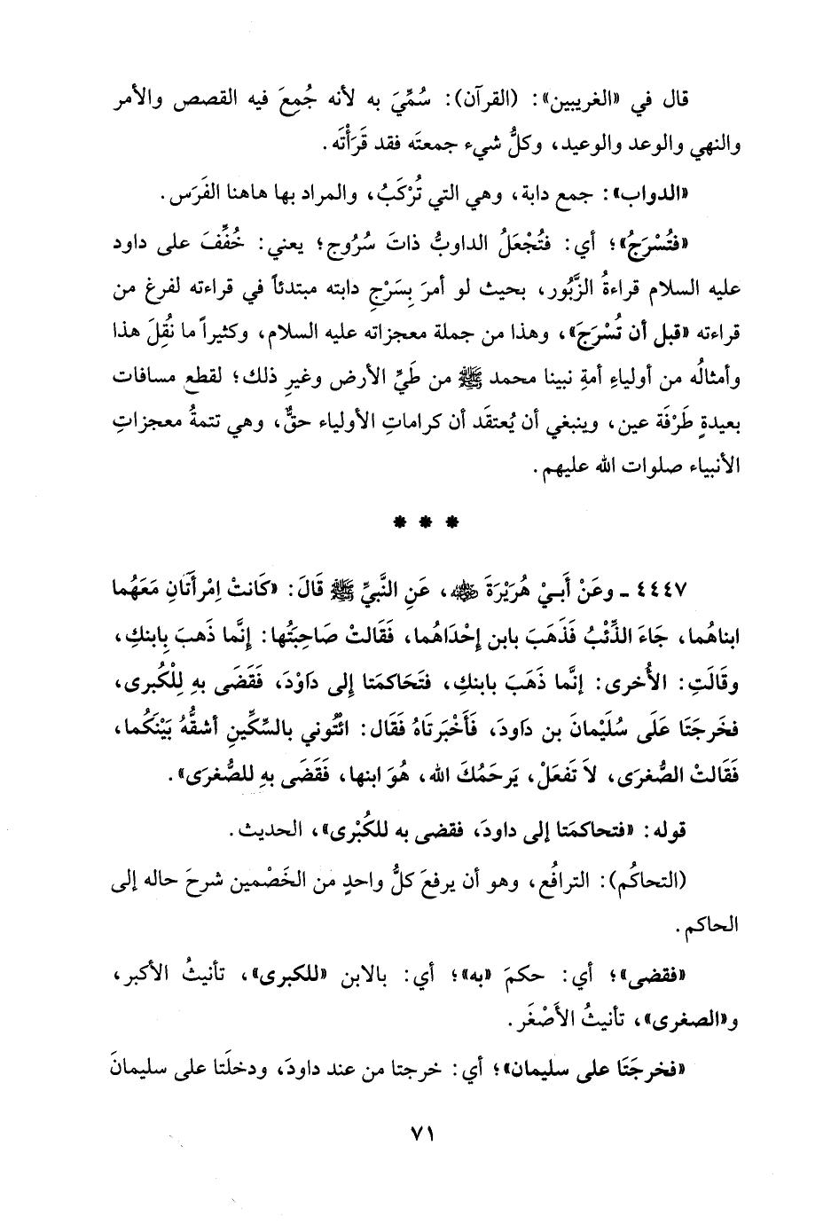 4447 - وعَنْ أَبيْ هُرَيْرَةَ - رضي الله عنه -، عَنِ النَّبيِّ - صلى الله عليه وسلم - قَالَ: "كَانتْ اِمْرأتَانِ مَعَهُما ابناهُما، جَاءَ الذِّئْبُ فَذَهَبَ بابن إِحْدَاهُما، فَقَالتْ صَاحِبَتُها: إنَّما ذَهبَ بِابنكِ، وقَالَتِ: الأُخرى: إنَّما ذَهَبَ بابنكِ، فتَحَاكمَتا إِلى دَاوْدَ، فَقَضَى بهِ لِلْكُبرى، فخَرجَتَا عَلَى سُلَيْمانَ بن داودَ، فَأخْبَرتَاهُ فَقَال: ائْتُوني بالسِّكَينِ أشقُّهُ بَيْنَكُما، فَقَالتْ الصُّغرَى، لَا تَفعَلْ، يَرحَمُكَ الله، هُوَ ابنها، فَقَضَى بهِ للصُّغرَى".