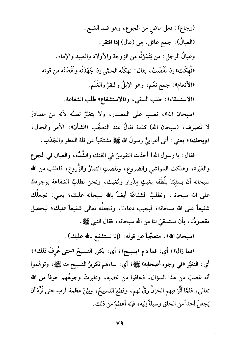"سبحان الله"، نصب على المصدر، ولا يتغيَّرُ نصبُه لأنه من مصادرَ لا تنصرف، (سبحان الله) كلمة تقالُ عند التعجُّب "الشأن": الأمر والحال، "ويحك"؛ يعني: أتى أعرابيٌّ رسولَ الله - صلى الله عليه وسلم - مشتكيًا عن قلة المطر والجَدْب.