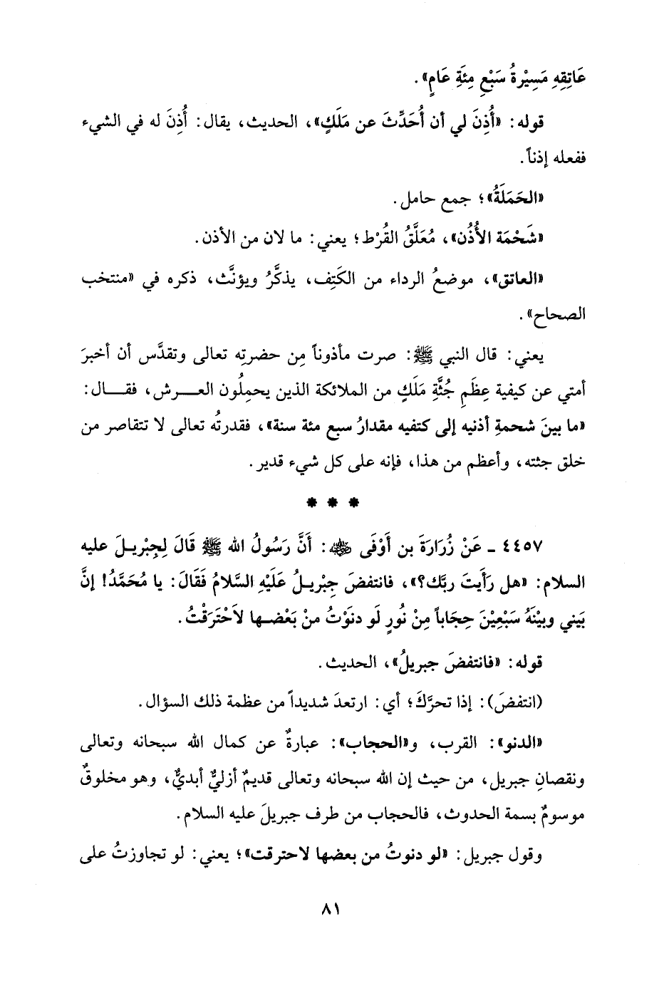 4457 - عَنْ زُرَارَةَ بن أَوْفَى - رضي الله عنه -: أَنَّ رَسُولُ الله - صلى الله عليه وسلم - قَالَ لِجبْريلَ عليه السلام: "هل رَأَيتَ ربَّك؟ "، فانتفضَ جِبْريلُ عَلَيْهِ السَّلامُ فَقَالَ: يا مُحَمَّدُ! إنَّ بَيني وبيْنَهُ سَبْعِيْنَ حِجَابًا مِنْ نُورٍ لَو دنَوْتُ منْ بَعْضها لَاحْتَرَقْتُ.
