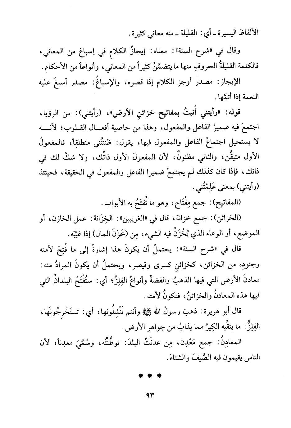وقال في "شرح السنة": معناه: إيجازُ الكلامِ في إسباغ من المعاني، فالكلمة القليلةُ الحروفِ منها ما يتضمَّنُ كثيرًا من المعاني، وأنواعًا من الأحكام.