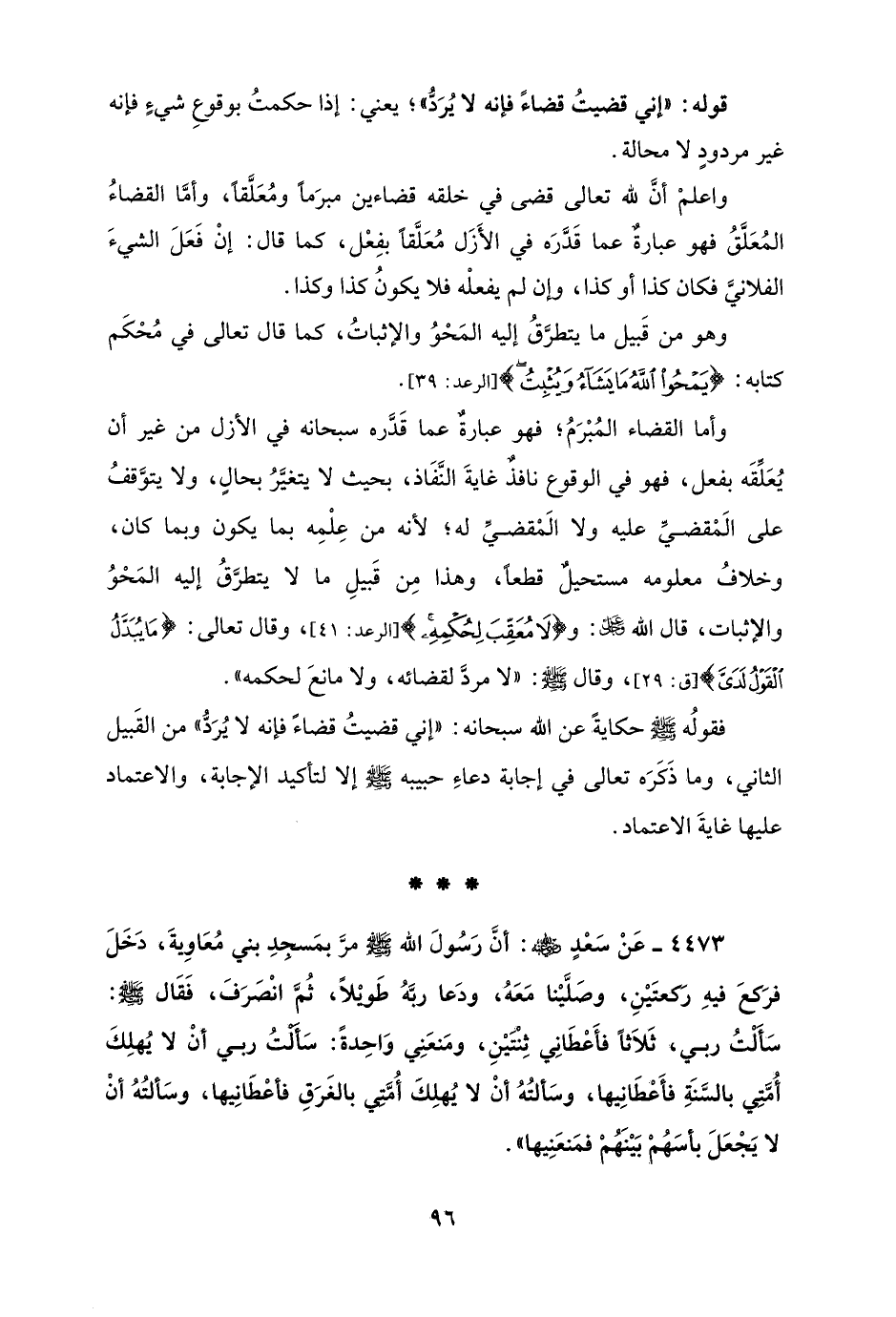 4473 - عَنْ سَعْدٍ - رضي الله عنه -: أنَّ رَسُولَ الله - صلى الله عليه وسلم - مرَّ بمَسجِدِ بني مُعَاوِيةَ، دَخَلَ فرَكعَ فيهِ رَكعتَيْنِ، وصَلَّيْنا مَعَهُ، ودَعا ربَّهُ طَوْيلاً، ثمَ انْصَرَفَ، فَقَال - صلى الله عليه وسلم -: سَأَلْتُ ربي، ثَلاَثًا فأَعْطَانِي ثِنْتَيْنِ، ومَنعَنِي وَاحِدةً: سَألتُ ربي أنْ لا يُهلِكَ أُمَّتِي بالسَّنَةِ فأَعْطَانِيها، وسَألتُهُ أنْ لا يُهلِكّ أُمَّتي بالغَرَقِ فأعْطَانِيها، وسَألتُهُ أنْ لا يَجْعَلَ بأسَهُمْ بَيْنَهُمْ فمَنعَنِيها".