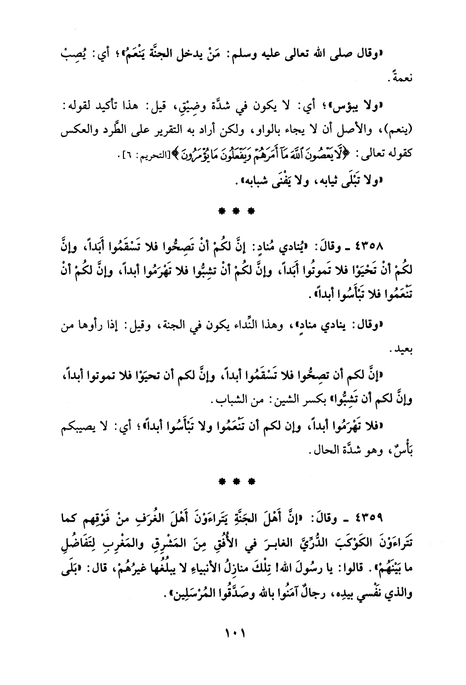 4358 - وقالَ: " يُنادي مُنادٍ: إنَّ لكُمْ أنْ تَصِحُّوا فلا تَسْقَمُوا أَبَدًا، وإنَّ لكُمْ أنْ تَحْيَوْا فلا تَموتُوا أَبَدًا، وإنَّ لكُمْ أنْ تشِبُّوا فلا تَهْرَمُوا أبدًا، وإنَّ لكُمْ أنْ تَنْعَمُوا فلا تَبْأَسُوا أبدًا ".