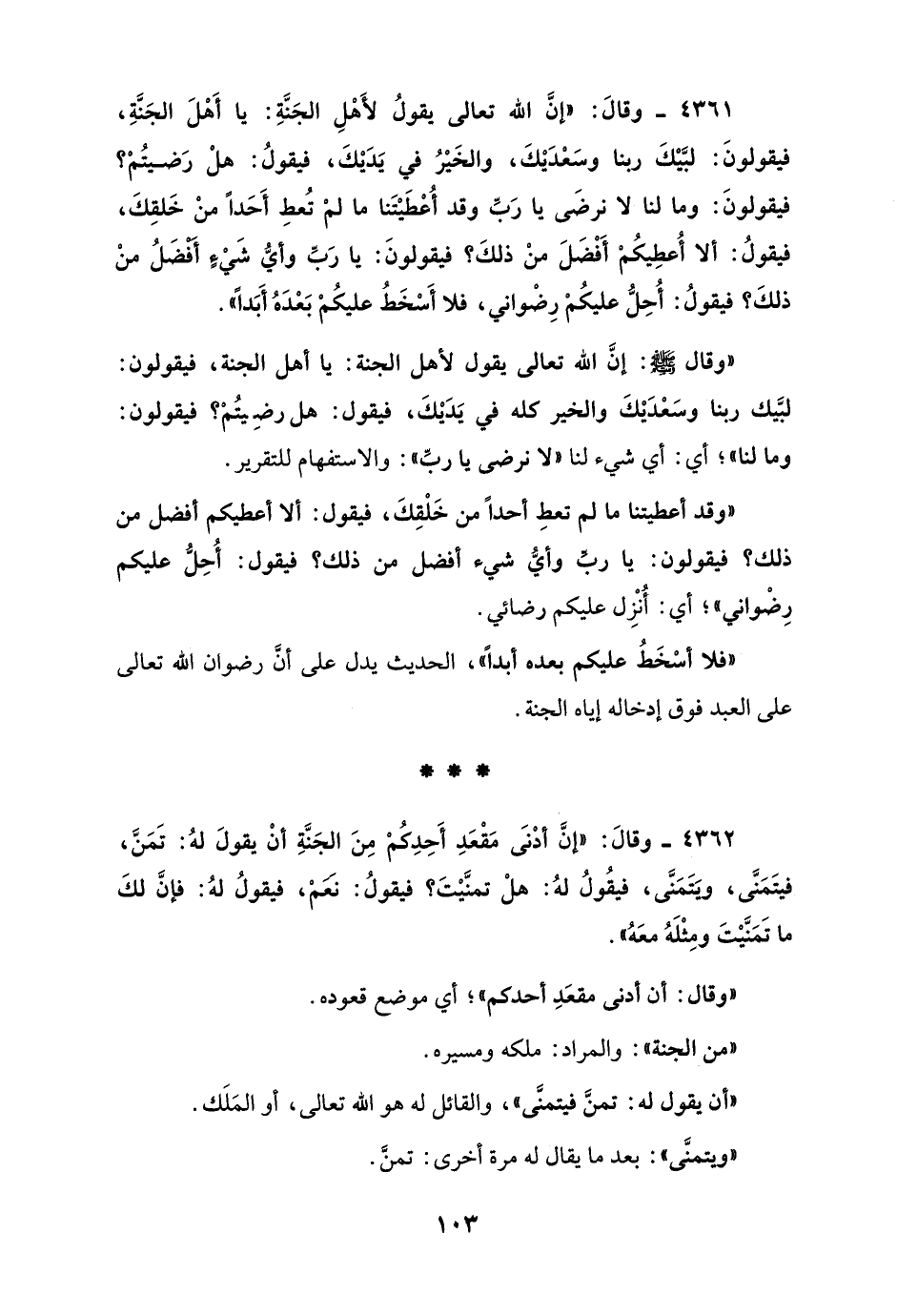 4361 - وقالَ: " إنَّ الله تعالى يقولُ لأَهْلِ الجَنَّةِ: يا أَهْلَ الجَنَّةِ، فيقولونَ: لبَّيْكَ ربنا وسَعْدَيْكَ، والخَيْرُ في يَدَيْكَ، فيقولُ: هلْ رَضيتُمْ؟ فيقولونَ: وما لنا لا نرضَى يا رَبِّ وقد أُعْطَيْتَنا ما لمْ تُعطِ أَحَدًا منْ خَلقِكَ، فيقولُ: ألا أُعطِيكُمْ أَفْضَلَ منْ ذلكَ؟ فيقولونَ: يا رَبِّ وأيُّ شَيْءٍ أَفْضَلُ منْ ذلكَ؟ فيقولُ: أُحِلُّ عليكُمْ رِضْواني، فلا أَسْخَطُ عليكُمْ بَعْدَهُ أَبَدًا ".