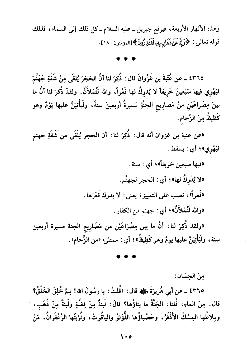 4364 - عن عُتْبةَ بن غَزْوانَ قال: ذُكِرَ لنا أنَّ الحَجَرَ يُلقَى مِنْ شَفَةِ جَهَنَّمَ فيَهْوِي فيها سَبْعينَ خَرِيفًا لا يُدرِكُ لها قَعْرًا، والله لَتُمْلأَنَّ. ولقدْ ذُكرَ لنا أنَّ ما بينَ مِصْراعَيْنِ منْ مَصارِيعِ الجنَّةِ مَسيرةُ أربعينَ سنةً، ولَيأْتيَنَّ عليها يَوْمٌ وهو كَظيظٌ مِنَ الزِّحامِ.