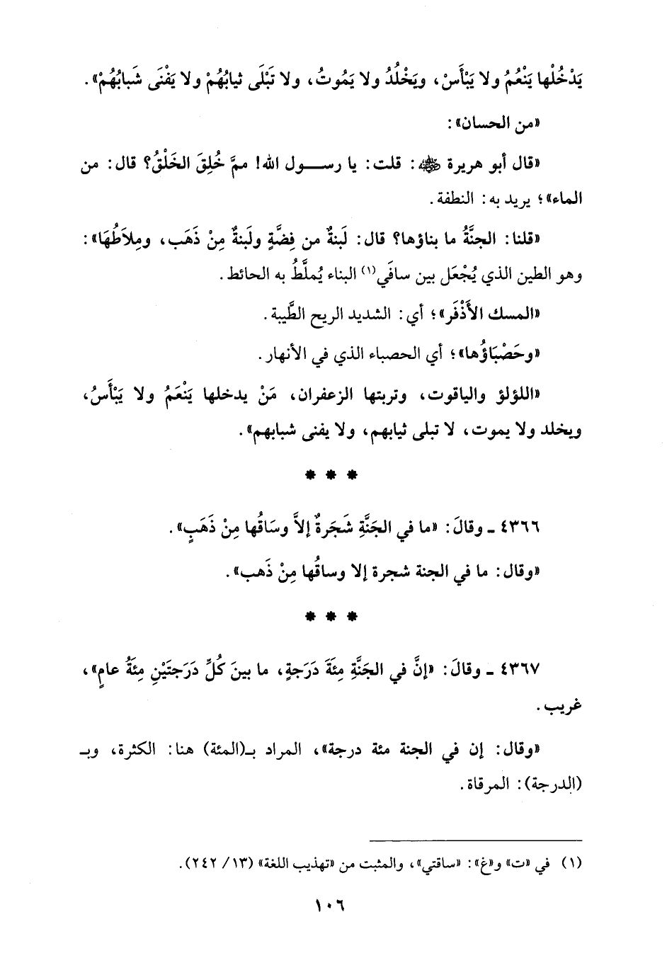 4367 - وقالَ: " إنَّ في الجَنَّةِ مِئَةَ دَرَجةٍ، ما بينَ كُلِّ دَرَجتَيْنِ مِئَةُ عامٍ "، غريب.