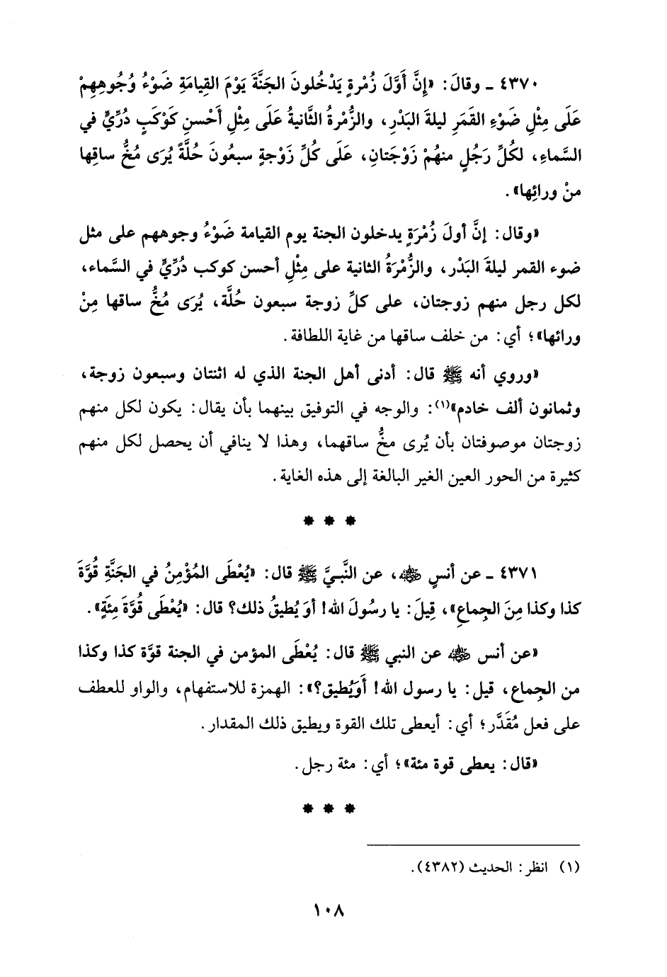" وقال: إنَّ أولَ زُمْرَةٍ يدخلون الجنّة يوم القيامة ضَوْءُ وجوههم على مثل ضوء القمر ليلةَ البَدْر، والزُّمْرَةُ الثانية على مِثْلِ أحسن كوكب دُرِّيٍّ في السَّماء، لكل رجل منهم زوجتان، على كُلِّ زوجة سبعون حُلَّة، يُرَى مُخُّ ساقها مِنْ ورائها"؟ أي: من خلف ساقها من غاية اللطافة.