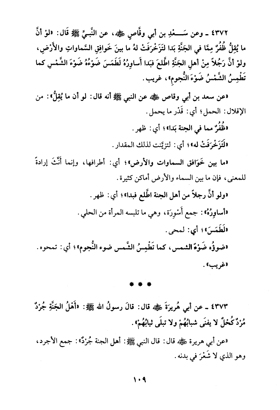 4372 - وعن سَعْدِ بن أبي وقَّاصٍ - رضي الله عنه -، عن النَّبيِّ - صلى الله عليه وسلم - قَال: " لوْ أنَّ ما يُقِلُّ ظُفُرٌ مِمَّا في الجَنَّةِ بَدا لتَزَخْرَفَتْ لهُ ما بينَ خَوافِقِ السَّماواتِ والأَرْضِ، ولوْ أنَّ رَجُلًا مِشْ أهلِ الجَنَّةِ اطَّلعَ فبَدا أَساوِرُهُ لَطَمَسَ ضَوْءُهُ ضَوْءَ الشَّمْسِ كما تَطْمِسُ الشَّمْسُ ضَوْءَ النُّجومِ "، غريب.