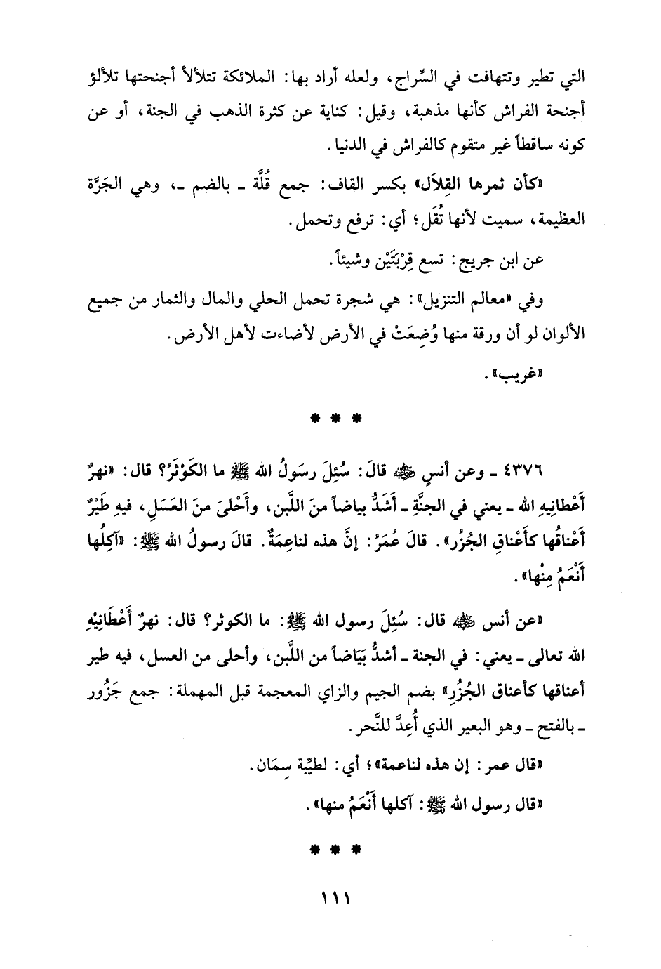 4376 - وعن أنسٍ - رضي الله عنه - قالَ: سُئِلَ رسَولُ الله - صلى الله عليه وسلم - ما الكَوْثَرُ؟ قال: " نهرٌ أَعْطانِيهِ الله - يعني في الجنَّةِ - أَشَدُّ بياضًا منَ اللَّبن، وأَحْلىَ منَ العَسَلِ، فيهِ طَيْرٌ أَعْناقُها كأَعْناقِ الجُزُر ". قالَ عُمَرُ: إنَّ هذه لناعِمَةٌ. قالَ رسولُ الله - صلى الله عليه وسلم -: " آكِلُها أَنْعَمُ مِنْها ".