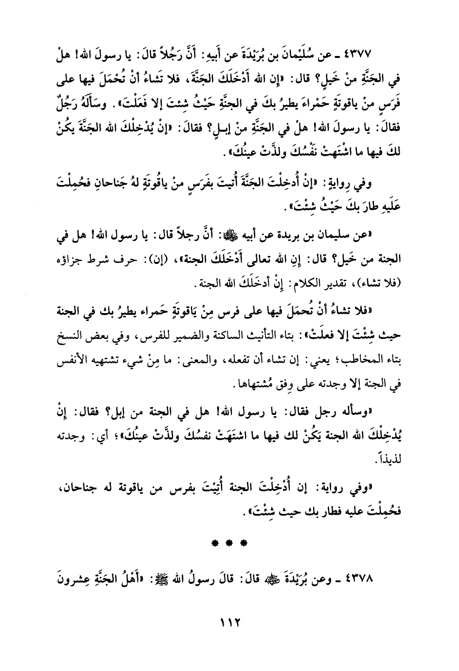 4377 - عن سُلَيْمانَ بن بُرَيْدَةَ عن أَبيهِ: أَنَّ رَجُلًا قالَ: يا رسولَ الله! هلْ في الجَنَّةِ منْ خَيلٍ؟ قال: " إِن الله أَدْخَلَكَ الجَنَّةَ، فلا تَشاءُ أنْ تُحْمَلَ فيها على فَرَسٍ منْ ياقوتَةٍ حَمْراءَ يطيرُ بكَ في الجنَّةِ حَيْثُ شِئتَ إلا فَعَلْتَ ". وسَأَلَهُ رَجُلٌ فقالَ: يا رسولَ الله! هلْ في الجَنَّةِ منْ إبلٍ؟ فقالَ: " إنْ يُدْخِلْكَ الله الجَنَّةَ يكُنْ لكَ فيها ما اشْتَهتْ نَفْسُكَ ولذَّتْ عينُكَ ".