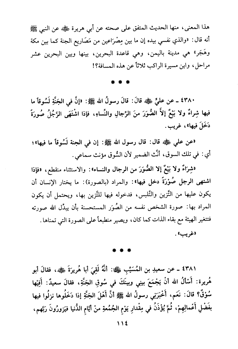 4381 - عن سعيدٍ بن المُسَيِّبِ - رضي الله عنهما -: أنَّهُ لَقِيَ أبا هُريرَةَ - رضي الله عنه -، فقالَ أبو هُريرة: أَسْألُ الله أنْ يَجْمَعَ بينِي وبينَكَ في سُوقِ الجَنَّةِ، فقالَ سعيدٌ: أَفِيْها سُوْقٌ؟ قالَ: نعَم، أَخْبَرَنِي رسولُ الله - صلى الله عليه وسلم - أنَّ أَهْلَ الجَنَّةِ إذا دَخَلُوها نزلُوا فيها بفَضْلِ أَعْمالِهِمْ، ثُمَّ يُؤْذَنُ في مِقْدارِ يَوْمِ الجُمُعةِ منْ أَيَّامِ الدُّنيا فيَزورُونَ رَبَّهم،