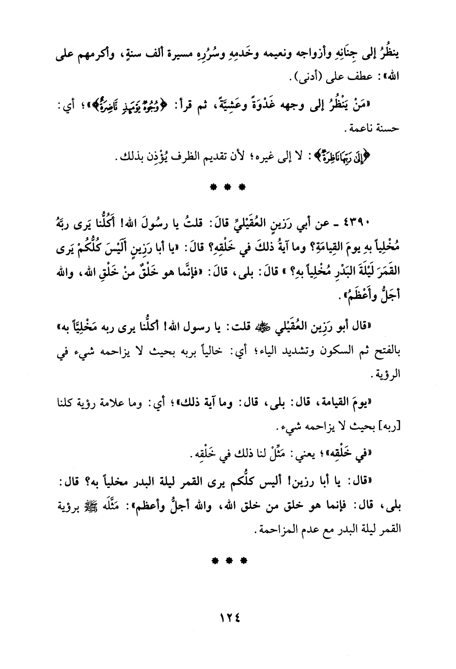 4390 - عن أبي رَزينٍ العُقَيْليِّ قالَ: قلتُ يا رسُولَ الله! أَكُلُّنا يَرى ربَّهُ مُخْلِيًا بهِ يومَ القِيامَةِ؟ وما آيةُ ذلكَ في خَلْقِهِ؟ قالَ: " يا أبا رَزِينٍ أَلَيْسَ كُلُّكُمْ يَرى القَمَرَ لَيْلَةَ البَدْرِ مُخْلِيًا بهِ؟ " قالَ: بلى، قالَ: " فإنَّما هو خَلْقٌ منْ خَلْقِ الله، والله أجَلُّ وأَعْظَمُ ".