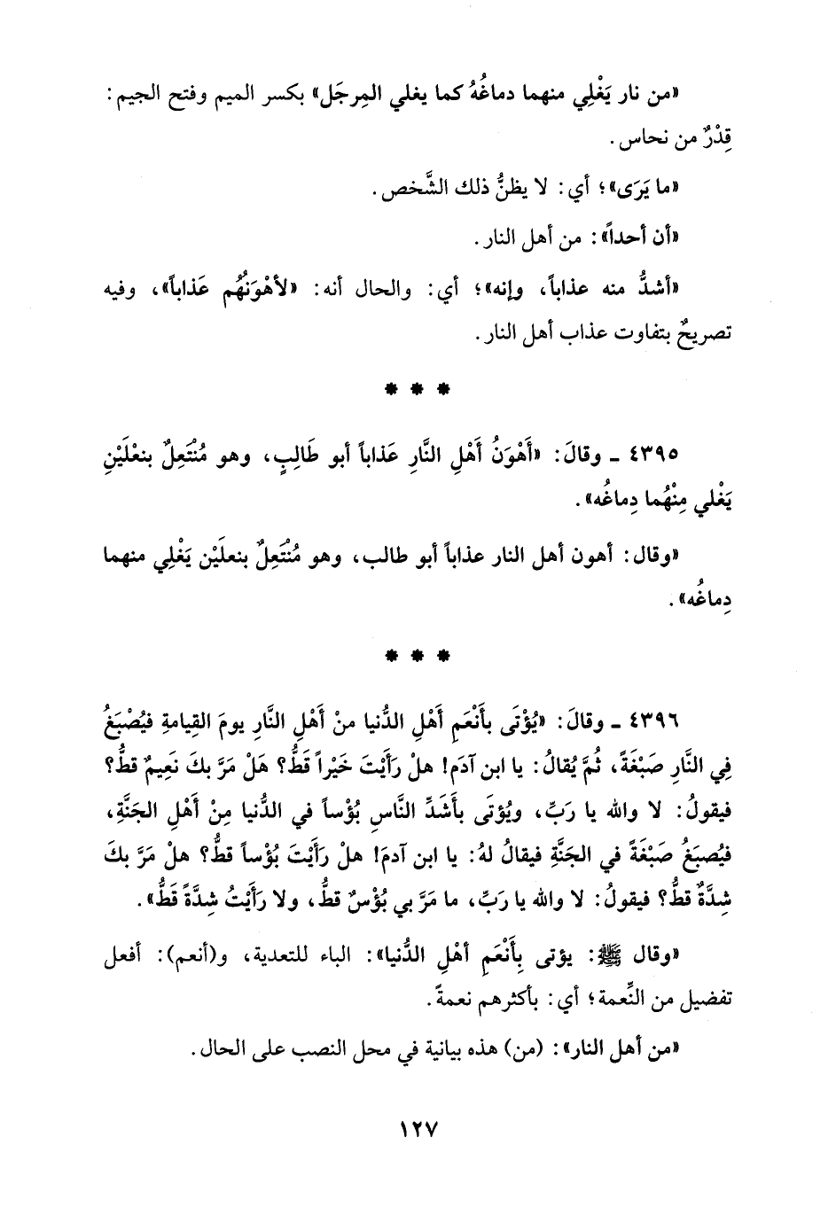 4395 - وقالَ: " أَهْوَنُ أَهْلِ النَّارِ عَذابًا أبو طَالِبٍ، وهو مُنْتَعِلٌ بنعْلَيْنِ يَغْلي مِنْهُما دِماغُه ".