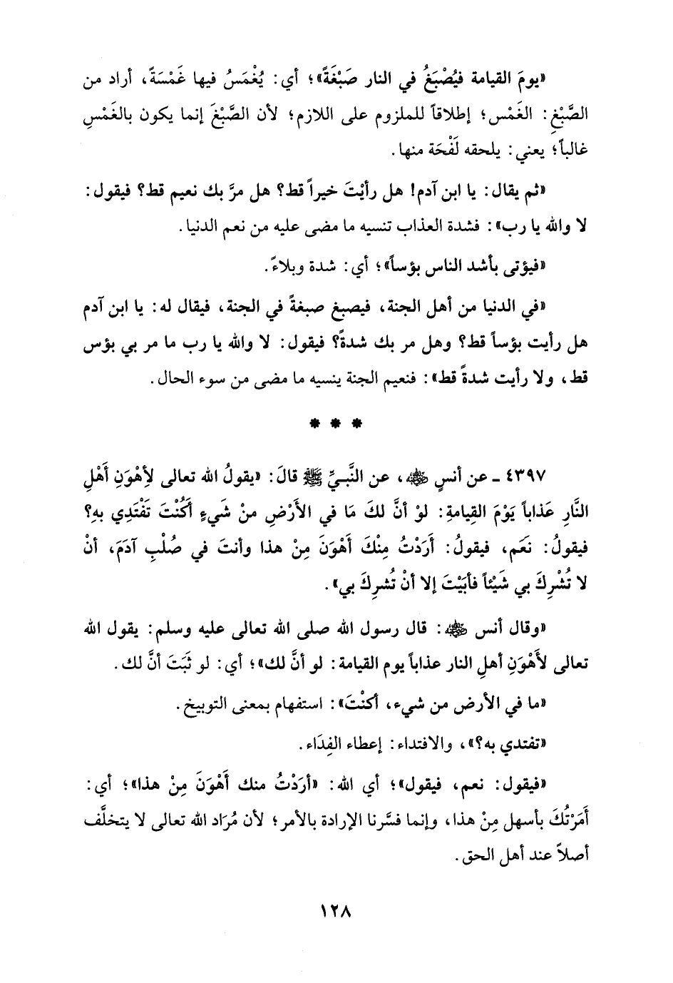 4397 - عن أنسٍ - رضي الله عنه -، عن النَّبيِّ - صلى الله عليه وسلم - قالَ: " يقولُ الله تعالى لأِهْوَنِ أَهْلِ النَّارِ عَذابًا يَوْمَ القِيامةِ: لوْ أنَّ لكَ مَا في الأَرْضِ منْ شَيءٍ أَكُنْتَ تَفْتَدِي بهِ؟ فيقولُ: نَعَم، فيقولُ: أَرَدْتُ مِنْكَ أَهْوَنَ مِنْ هذا وأنتَ في صُلْبِ آدَمَ، أنْ لا تُشْرِكَ بي شَيْئًا فأبَيْتَ إلا أنْ تُشرِكَ بي ".