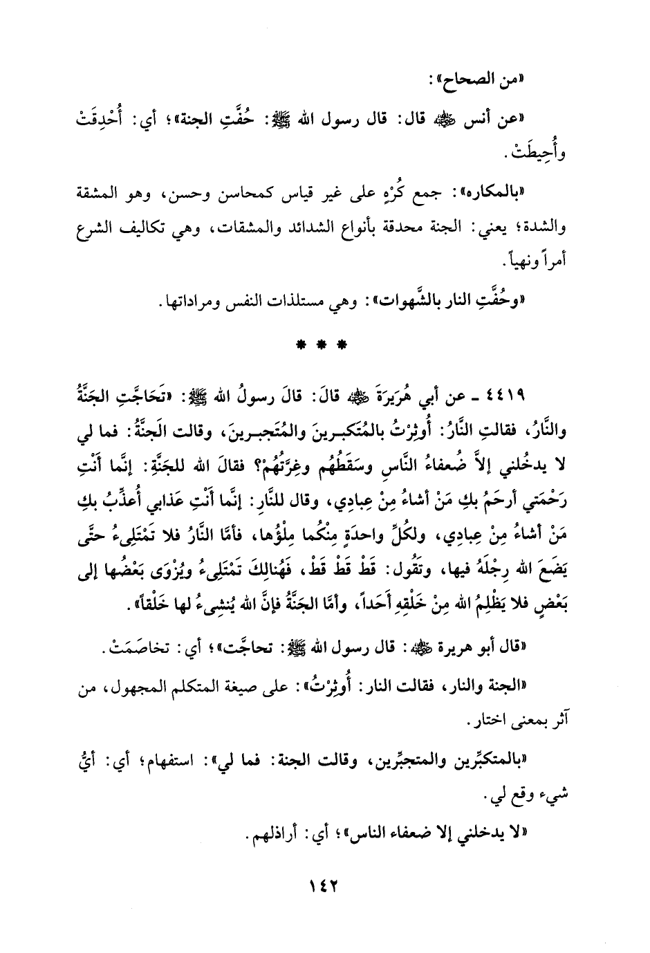 4419 - عن أبي هُرَيرَةَ - رضي الله عنه - قالَ: قالَ رسولُ الله - صلى الله عليه وسلم -: " تَحَاجَّتِ الجَنَّةُ والنَّارُ، فقالتِ النَّارُ: أُوثِرْتُ بالمُتَكبرينَ والمُتَجبرينَ، وقالت الجَنَّةُ: فما لي لا يدخُلني إلَّا ضُعفاءُ النَّاسِ وسَقَطُهُم وغِرَّتُهُمْ؟ فقالَ الله للجَنَّةِ: إنَّما أَنْتِ رَحْمَتي أرحَمُ بكِ مَنْ أشاءُ مِن عِبادِي، وقال للنَّارِ: إنَّما أَنْتِ عَذابي أُعذِّبُ بكِ مَنْ أشاءُ مِنْ عِبادِي، ولكُلِّ واحدَة مِنْكُما مِلْؤُها، فأمَّا النَّارُ فلا تَمْتَلِئُ حتَّى يَضَعَ الله رِجْلَهُ فيها، وتَقُول: قَطْ قَطْ قَطْ، فَهُنالِكَ تَمْتَلِئُ ويُرْوَى بَعْضُها إلى بَعْضٍ فلا يَظْلِمُ الله مِنْ خَلْقِهِ أَحَدًا، وأمَّا الجَنَّةُ فإن الله يُنشِئُ لها خَلْقًا ".