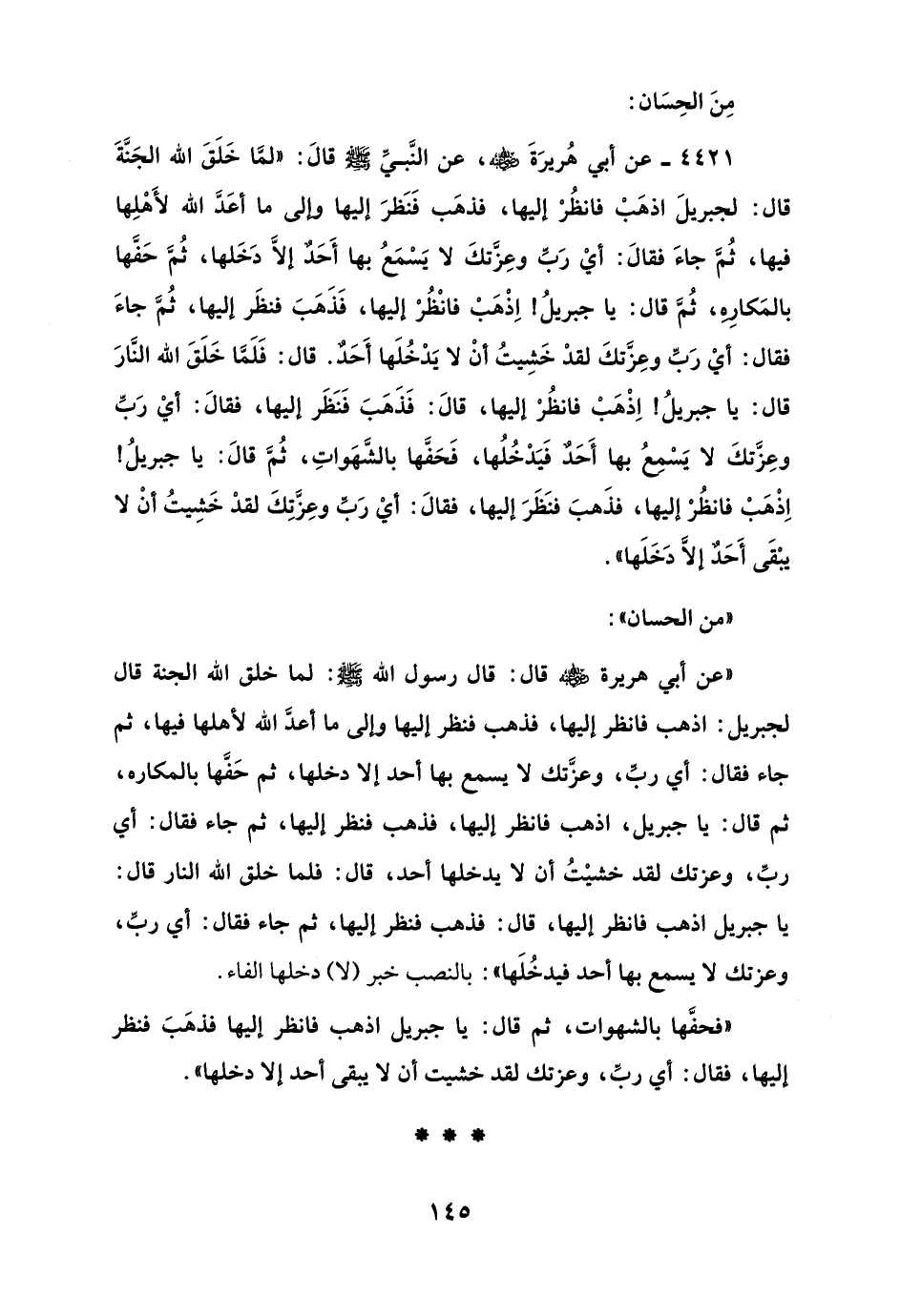 4421 - عن أبي هُريرَةَ - رضي الله عنه -، عن النَّبيِّ - صلى الله عليه وسلم - قالَ: " لمَّا خَلَقَ الله الجَنَّةَ قال: لجبريلَ اذهَبْ فانظُرْ إليها، فذهَب فَنَظرَ إليها وإلى ما أعَدَّ الله لأَهْلِها فيها، ثُمَّ جاءَ فقالَ: أيْ رَبِّ وعِزَّتكَ لا يَسْمَعُ بها أَحَدٌ إلَّا دَخَلها، ثُمَّ حَفَّها بالمَكارِهِ، ثُمَّ قال: يا جبريلُ! اِذْهَبْ فانْظُرْ إليها، فَذَهَبَ فنظَر إليها، ثمَّ جاءَ فقال: أيْ رَبِّ وعِزَّتكَ لقدْ خَشِيتُ أنْ لا يَدْخُلَها أَحَدٌ. قال: فَلَمَّا خَلَقَ الله النَّارَ قال: يا جبريلُ! اِذْهَبْ فانظُرْ إليها، قالَ: فَذَهَبَ فَنَظَر إليها، فقالَ: أيْ رَبِّ وعِزَّتكَ لا يَسْمِعُ بها أَحَدٌ فَيَدْخُلُها، فَحَفَّها بالشَّهَواتِ، ثُمَّ قالَ: يا جبريلُ! اِذْهَبْ فانظُرْ إليها، فذَهبَ فنَظَرَ إليها، فقالَ: أيْ رَبِّ وعِزَّتِكَ لقدْ خَشِيتُ أنْ لا يبْقَى أَحَدٌ إلَّا دَخَلَها ".