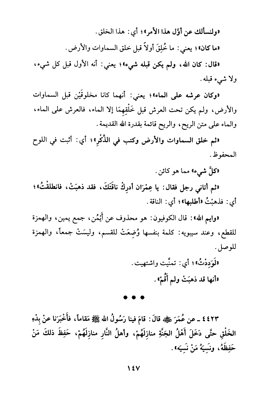 4423 - عن عُمَرَ - رضي الله عنه - قالَ: قامَ فينا رَسُولُ الله - صلى الله عليه وسلم - مَقامًا، فأَخْبَرَنا عنْ بِدْءِ الخَلْقِ حتَّى دَخَلَ أَهْلُ الجَنَّةِ منازِلَهُمْ، وأهلُ النَّارِ منازِلَهُمْ، حَفِظَ ذلكَ مَنْ حَفِظَهُ، ونسَيَهُ مَنْ نَسِيَه ".