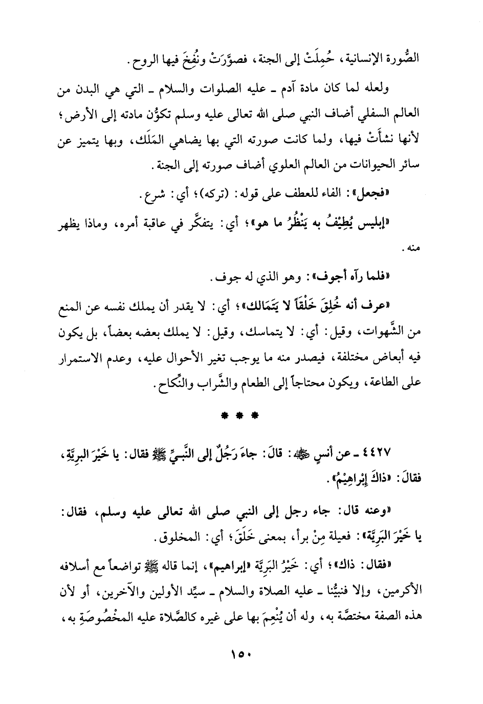 " وعنه قال: جاء رجل إلى النبي صلى الله تعالى عليه وسلم، فقال: يا خَيْرَ البَرِيَّة ": فعيلة مِنْ برأ، بمعنى خَلَقَ؛ أي: المخلوق.