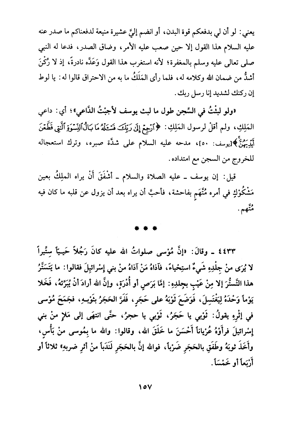 4433 - وقالَ: " إنَّ مُوْسى صلواتُ الله عليه كانَ رَجُلًا حَييًّا سِتِّيرًا لا يُرَى منْ جِلْدِهِ شَيءٌ استِحْياءً، فآذاهُ مَنْ آذاهُ منْ بني إِسْرائيِلَ فقالوا: ما يَتَسَتَّرُ هذا التَّستُّرَ إلا مِنْ عَيْبٍ بجِلدِهِ: أمَّا بَرَصٍ أو أُدْرَةٍ، وإنَّ الله أرادَ أنْ يُبَرِّئهُ، فَخَلا يَوْمًا وَحْدَهُ لِيَغْتَسِلَ، فَوَضَعَ ثَوْبَهُ على حَجَرٍ، فَفَرَّ الحَجَرُ بثَوْبهِ، فجَمَحَ مُوْسى في إثْرِهِ يقولُ: ثَوْبي يا حَجَرُ، ثَوْبي يا حجرُ، حتَّى انتهَى إلى مَلإٍ منْ بني إِسْرائيلَ فرأَوْهُ عُرْيانا أَحْسَنَ ما خَلَقَ الله، وقالوا: والله ما بِمُوسى منْ بَأْسٍ، وأَخَذَ ثوبَهُ وطَفَقِ بالحَجَرِ ضَرْبًا، فوالله إنَّ بالحَجَرِ لَنَدَبًا منْ أثرِ ضربهِ " ثلاثًا أو أَرْبَعًا أو خَمْسًا.