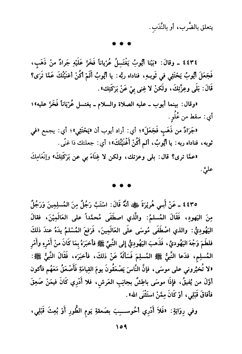 4434 - وقالَ: " بَيْنا أيُّوبُ يَغْتَسِلُ عُرْيانًا فَخَرَّ عَلَيْهِ جَرادٌ منْ ذَهَبٍ، فَجَعَلَ أيُّوبُ يَحْتَثِي في ثَوبهِ، فناداه ربُّه: يا أيُّوبُ أَلَمْ أكُنْ أغنَيْتُكَ عَمَّا تَرَى؟ قَالَ: بَلَى وعِزَّتِكَ، ولَكنْ لا غِنى بِيْ عَنْ بَرَكَتِك ".